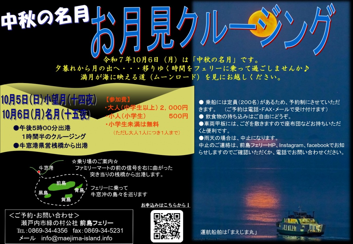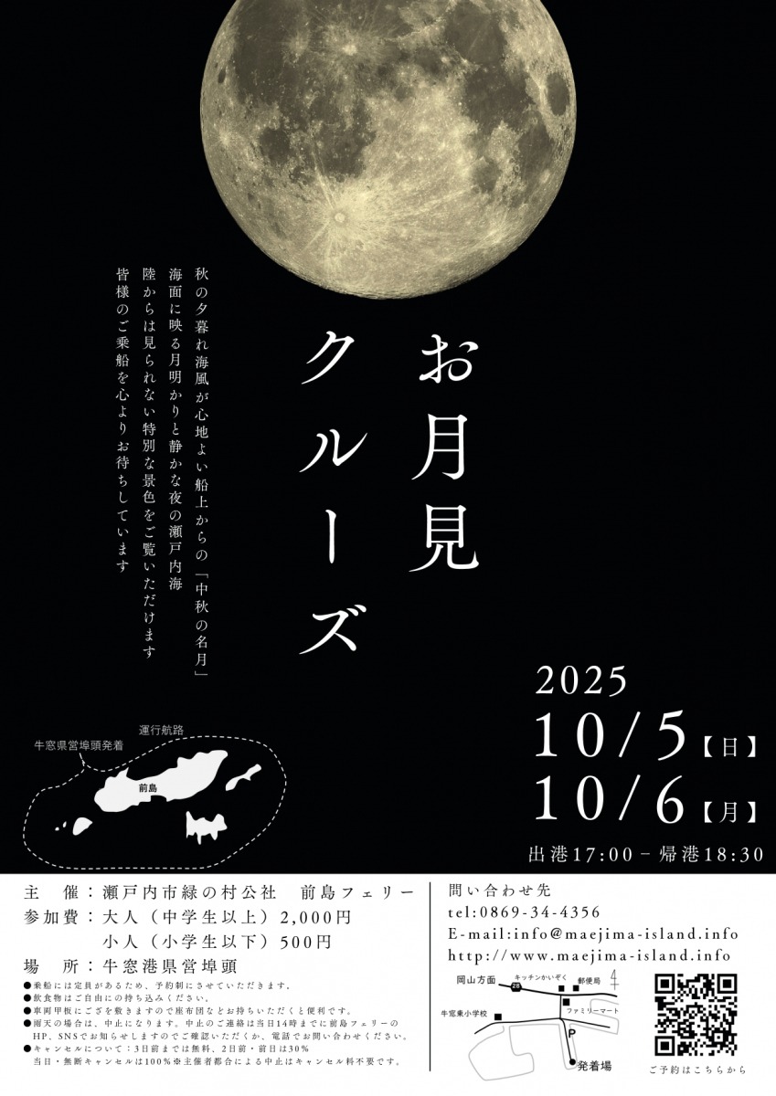 前島フェリー秋のイベント「お月見クルージング」が開催されます。夕暮れから月の出へ移りゆく時間をフェリーに乗って過すことができます。「日本の夕日百選」に選ばれた牛窓の夕日が沈む瞬間とその後に昇る満月。海面に映る月明かりと静かな夜の瀬戸内海、陸からは見られない特別な景色を見ることができます。