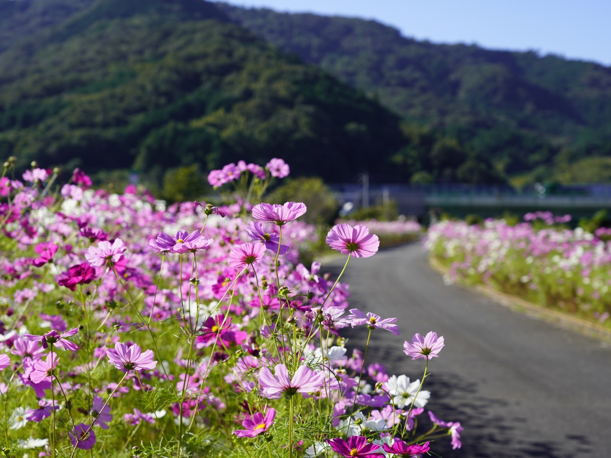 ピンクや白の40万本のコスモスが咲き誇るコスモス広場で、ステージイベントや特産品等の販売が行われます。備中川沿いの「コスモス街道」を歩く、コスモスウォーキングも同日開催。