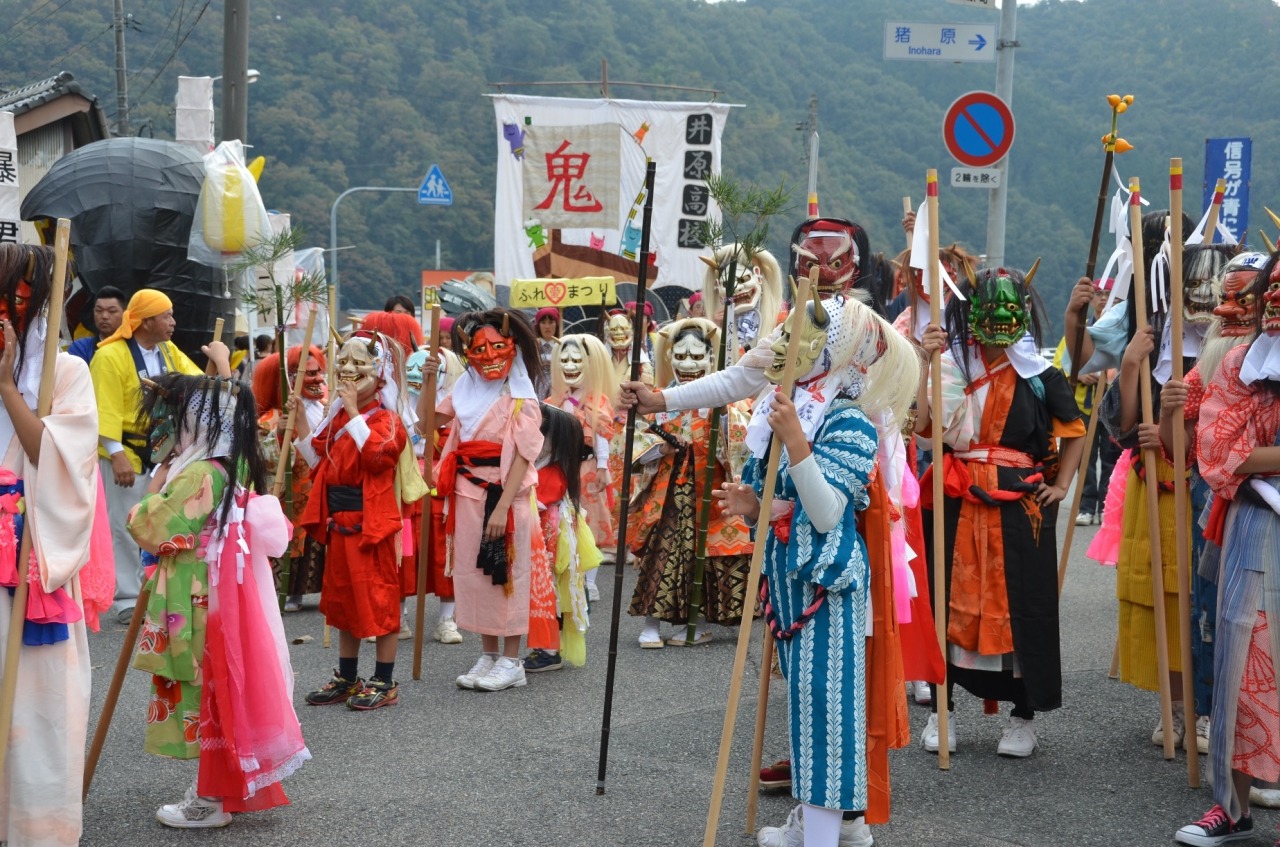 井原町の秋祭は別名「鬼まつり」と呼ばれ、約100匹の恐ろしい形相の鬼たちが御神幸の先払を務めます。向こう1年間の家内安全を願って鬼のタスキ(背中)や槍先にさした御幣を争奪すると無病息災の御利益があると言われています。