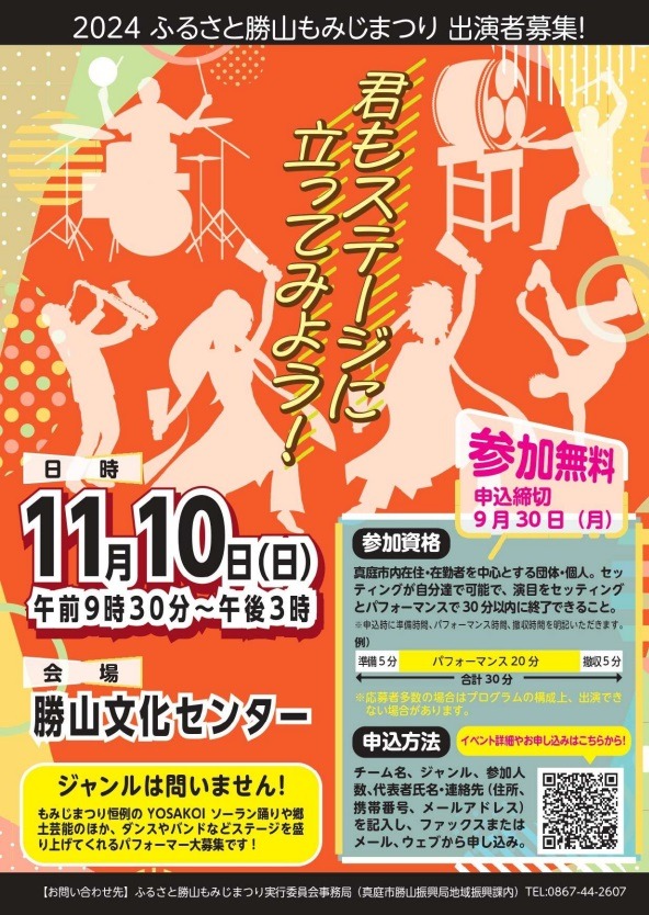 住民参加型のステージイベントやテント村物産展をメイン行事に、子どもから高齢者まで楽しめる「ふるさと勝山紅葉まつり」が開催されます。YOSAKOIソーラン踊り、餅つきや餅投げでにぎわい、地元特産品の販売もあります。