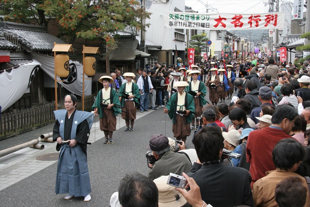 旧山陽道の宿場町として栄え、今も本陣、脇本陣の残る矢掛の町並み。絢爛豪華な総勢約80名もの大名行列が繰り広げられ、沿道で見学する人たちをタイムスリップした江戸時代の空間へ誘います。