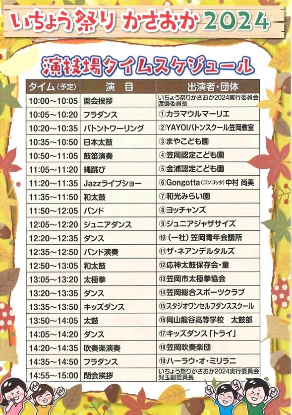 笠岡の木「いちょう」にちなんで、毎年11月に開催される人気イベントです。多彩なアトラクションが繰り広げられ賑わいます。マルシェや屋台村、商店街イベントなど様々な企画が予定されています。演技上では様々なステージイベントも開催されます。