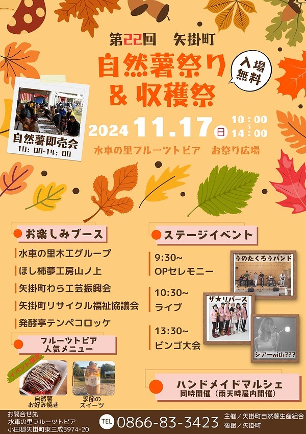 矢掛町の特産品である自然薯の販売をはじめ、自然薯のお好み焼きや季節のスイーツ、採れたての梨などフルーツトピアの人気メニューも盛りだくさん! バンド演奏やステージイベントも会場を盛り上げます。ハンドメイドのアクセサリーや雑貨、各種ワークショップなどが楽しめる「ハンドメイドマルシェ」も同日開催されます。