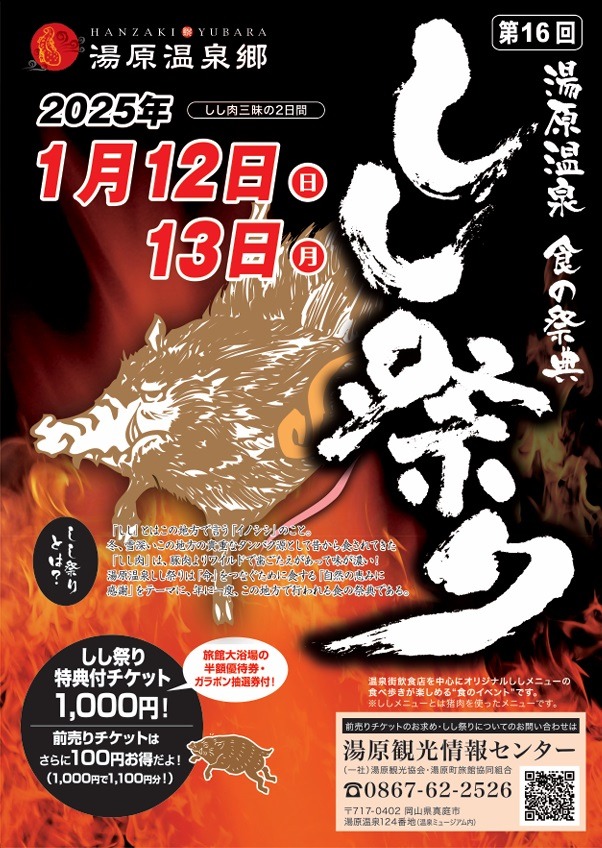 100円チケット10枚綴りの「しし祭りチケット」を買うと、湯原温泉の特産品が当たるガラポン抽選に参加できたり、日帰り入浴が半額で利用できてお得です!
