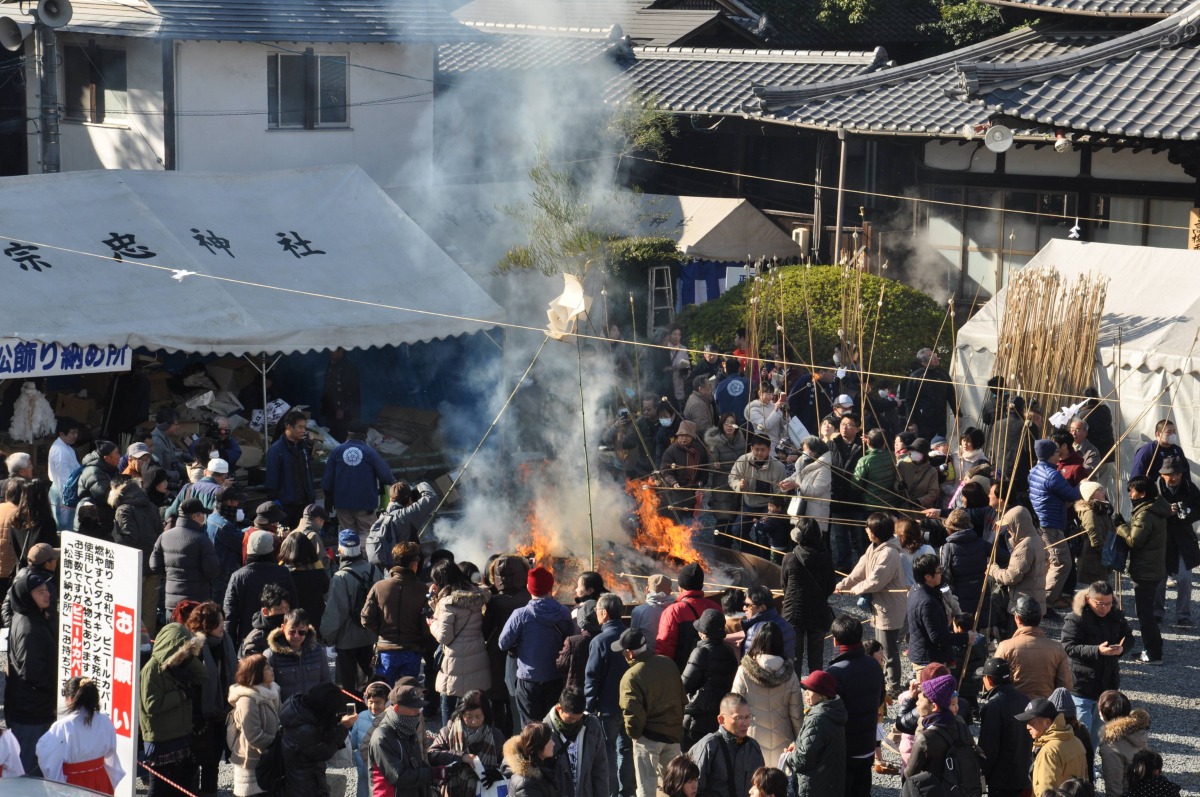 明治18年(1885)の宗忠神社鎮座当時から続けられており、平成3年から一般公開された神事です。一年間の無病息災を祈願して、「松飾り、書き初め、古札等」をお焚き上げします。当日は小餅を竹にはさんで”どんどの火”であぶり、”おぜんざい”に入れて食べ、一年の無病息災を祈ります。