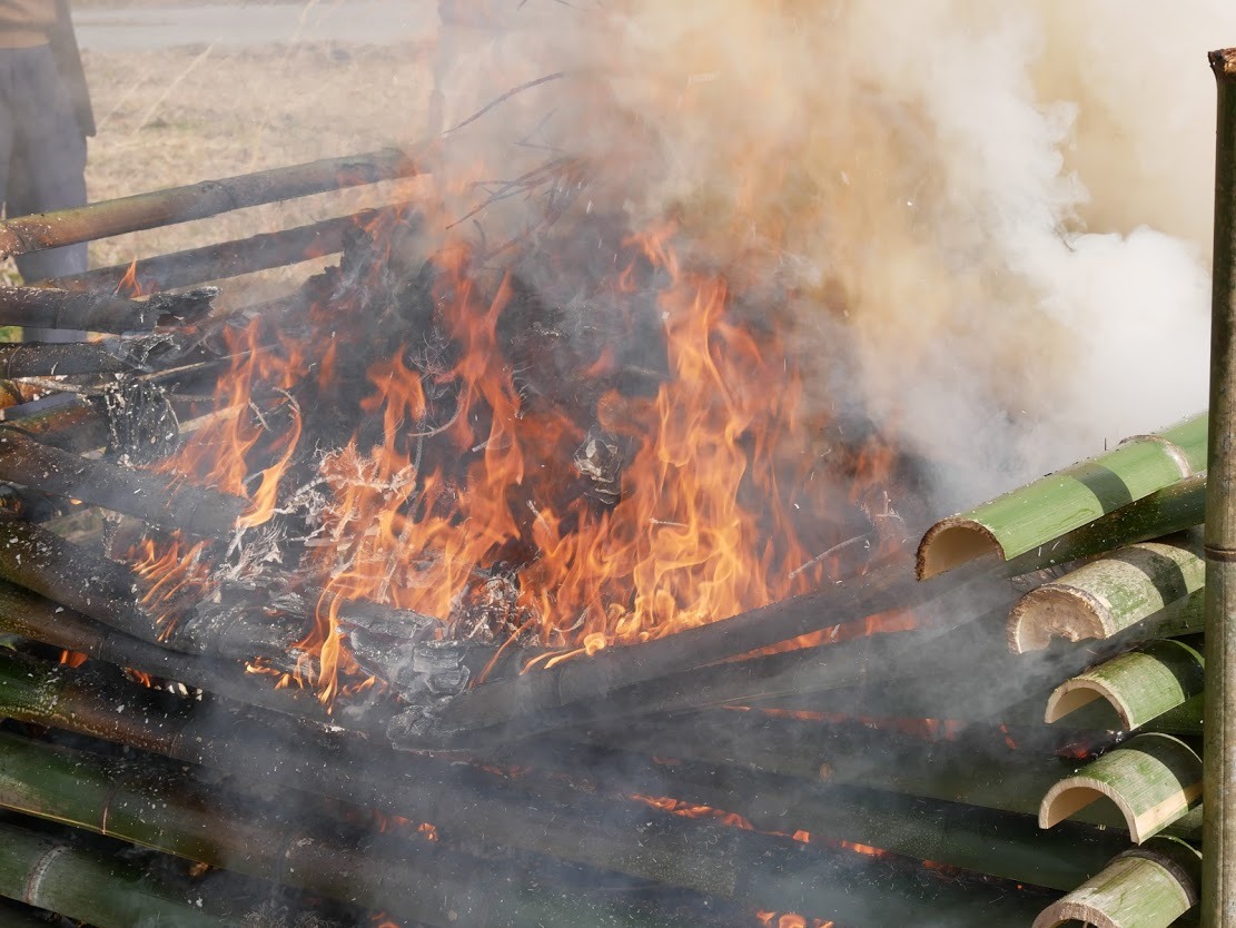 「てっちりこ」と呼ばれるわら細工で体の悪い所を叩き、お正月のお飾りや鏡餅を焼く鏡野町の伝統行事(とんど)です。