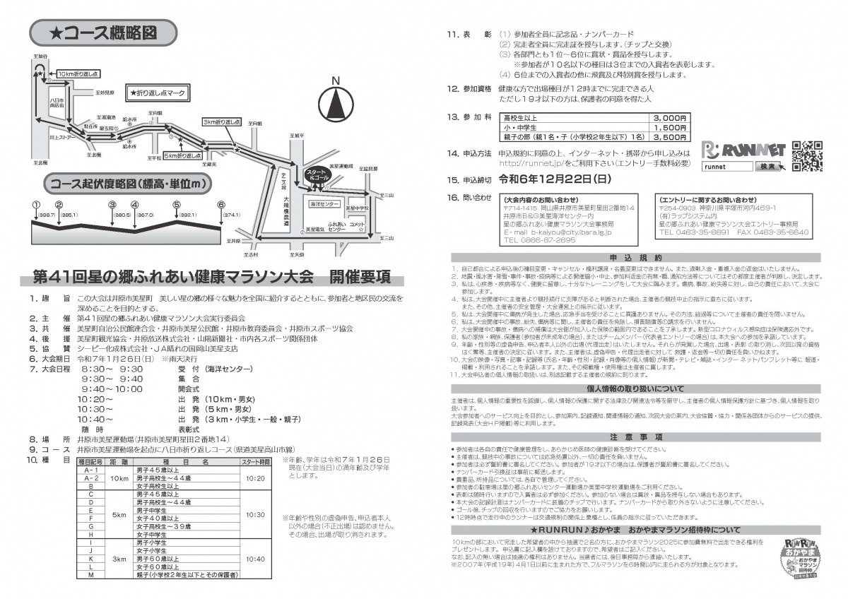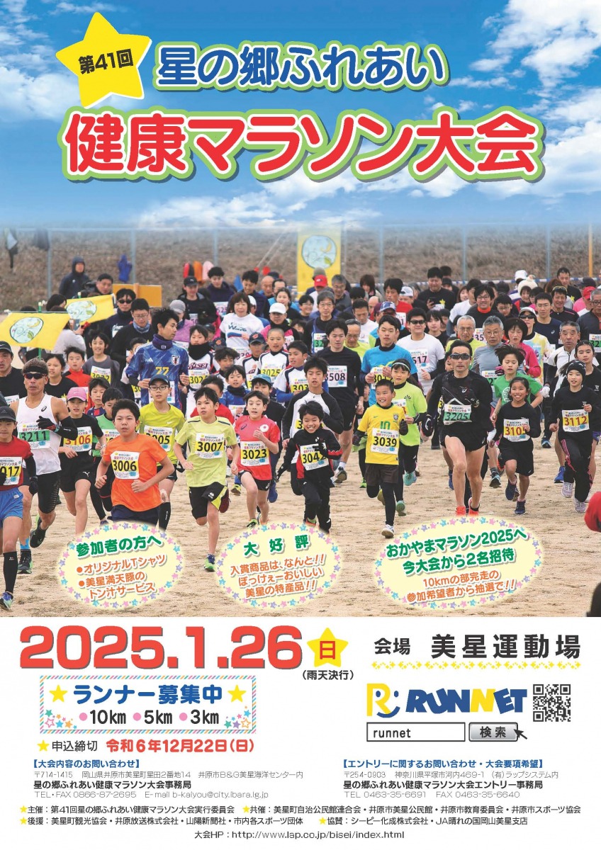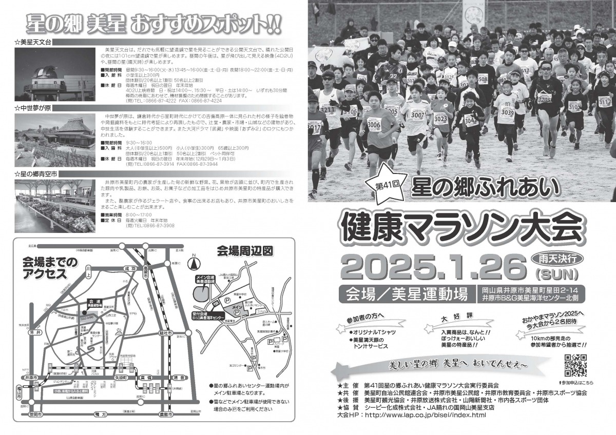 美星運動場を発着点に、3km、5km、10kmの3コース14部門で健脚を競う大会。会場近隣には、星の郷青空市・中世夢が原・美星天文台などの観光スポットもあります。入賞賞品は星の郷美星の美味しい特産品、美星満天豚のトン汁のサービスもあります。