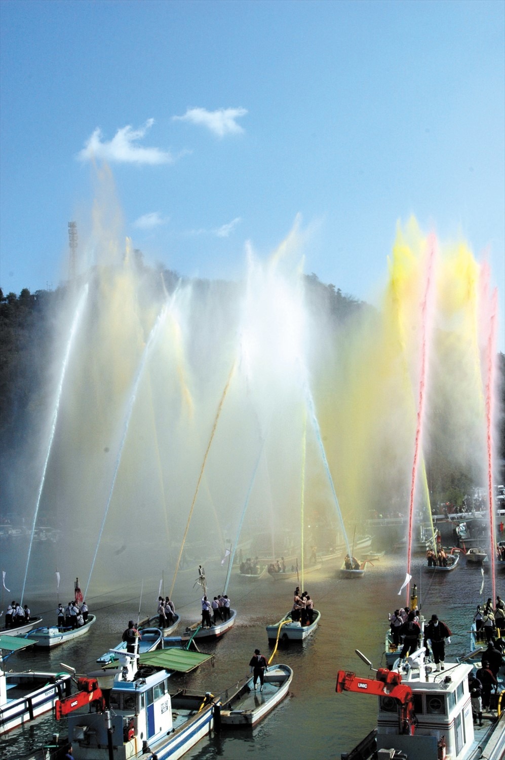 寒風吹きすさぶ中、紅白の旗を飾り、源平に分かれた消防団員が相手の舟を狙って放水合戦が行われます。フィナーレには一年の安泰を祈念し、五色の水を天高く放水します。※放水合戦は12:00~