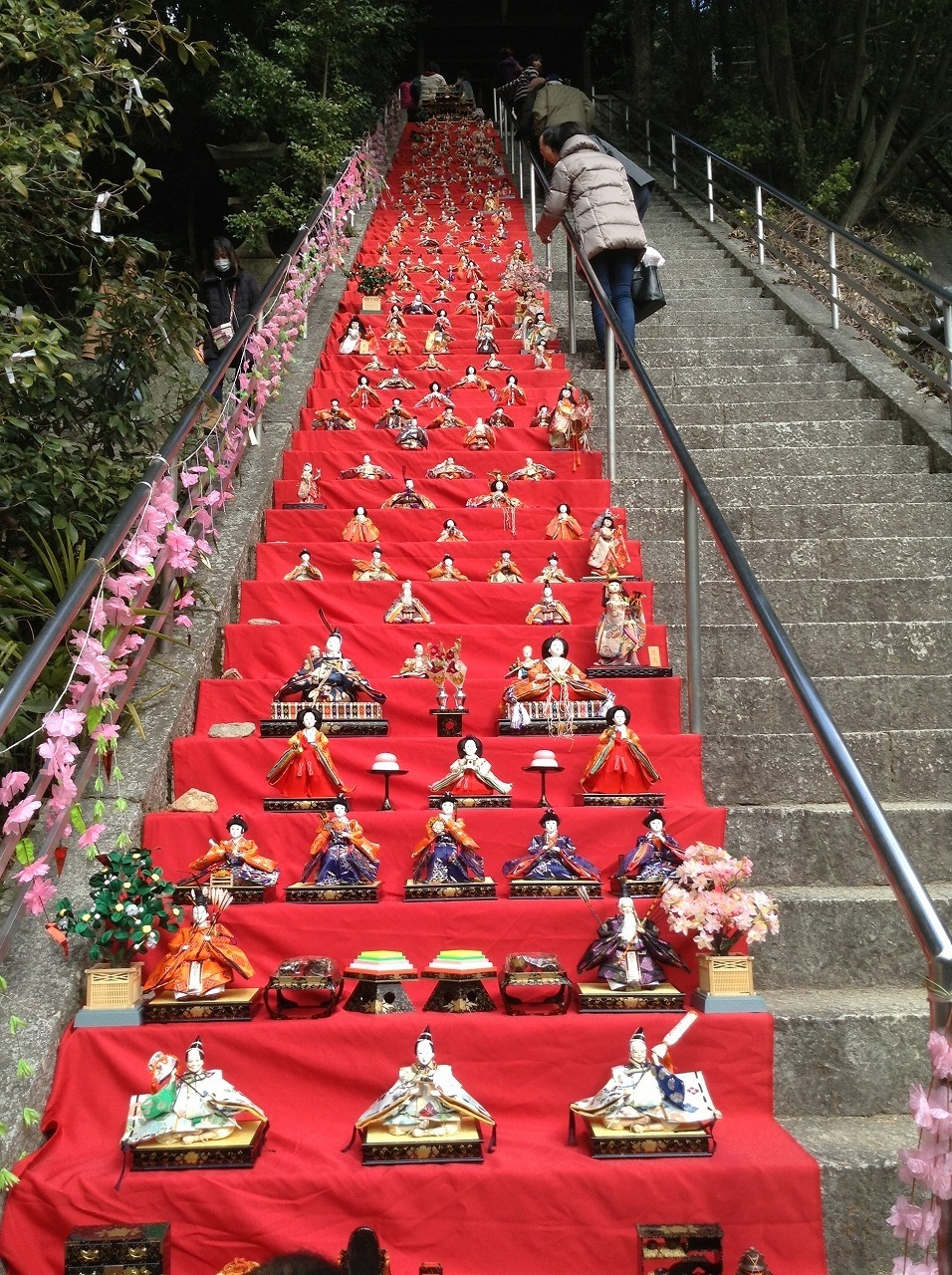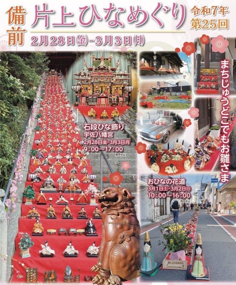 早春の風物詩「片上ひなめぐり」。宇佐八幡宮の62段の石段に並ぶ雛人形は圧巻です。土・日曜日には、片上商店街の歩道中央に「おひなの花道」が登場します。