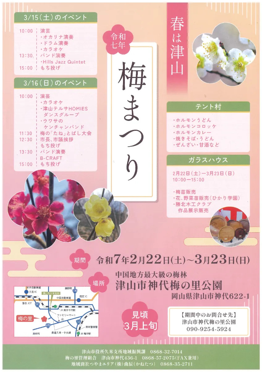 - 0868-57-2075(梅の里管理組合 ※梅まつり期間中の連絡先…TEL:090-9254-5924)