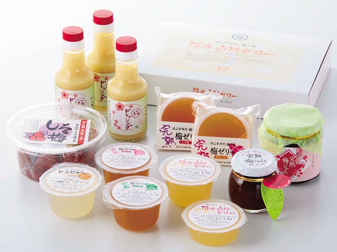 山頂へと続く遊歩道の紅梅、頂上の展望台からの眺めは抜群。梅干をはじめ、完熟梅ジャムや梅ゼリーなど、前年に収穫された梅の実を用いた加工品も販売されます。