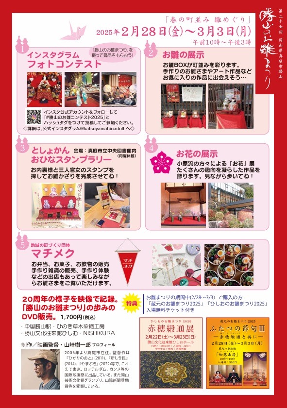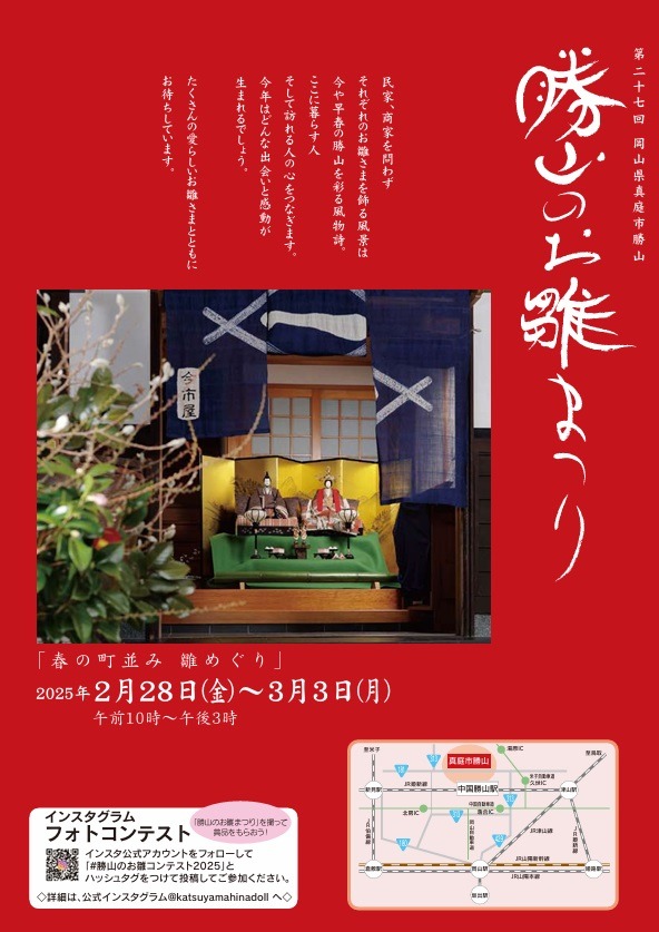 桃の節句を祝って道沿いに並ぶ160軒余りの民家や商家の軒先、部屋に飾ったお雛様を楽しむイベント。飾られるお雛様は江戸時代から代々受け継がれたものや平成雛、手作り雛まで多彩。家々で工夫を凝らしたディスプレイも見どころです。