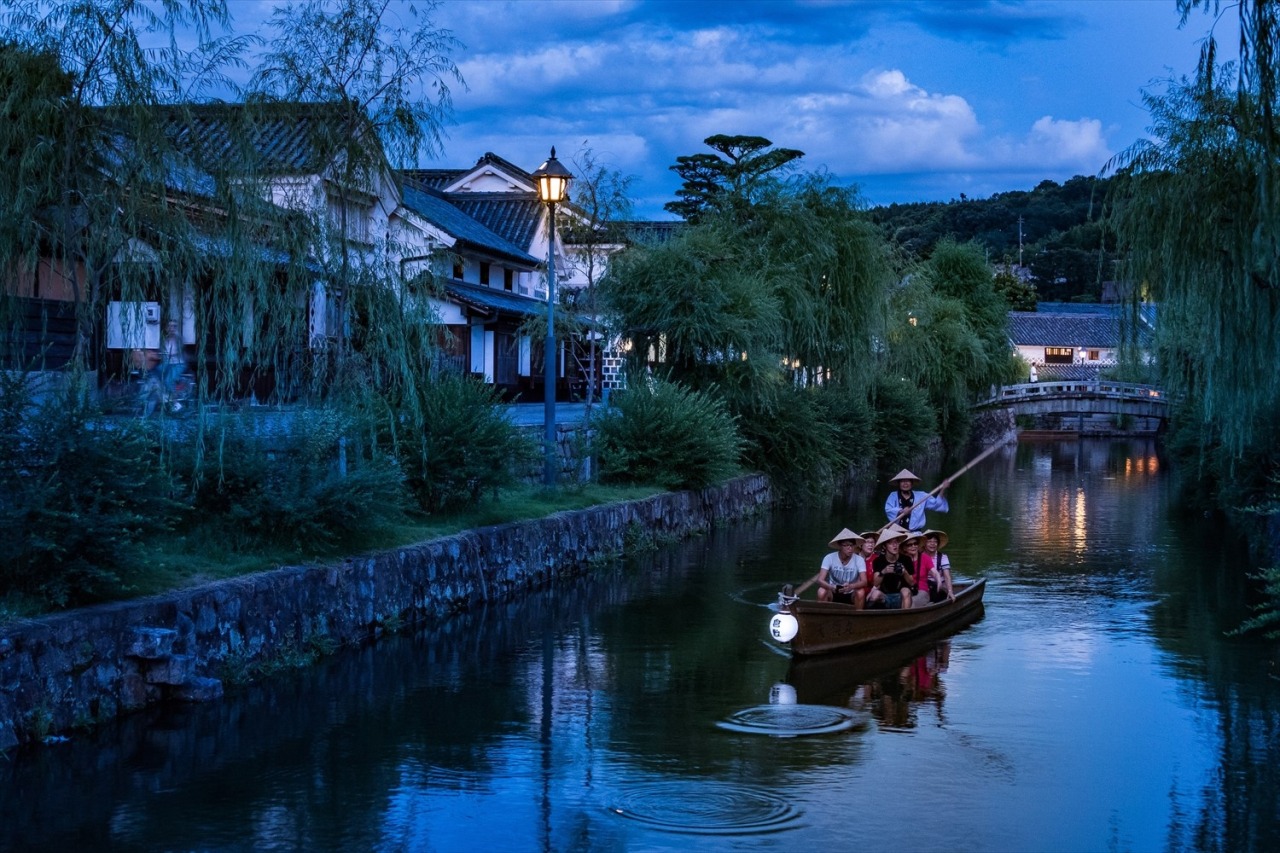 倉敷美観地区を流れる倉敷川で、川舟に乗って夜の街並みを眺めることができます。ライトアップに揺れる白壁の洋館など、趣ある建物の数々が、かつて物資を運ぶ運河の街として栄えた時代を彷彿させます。