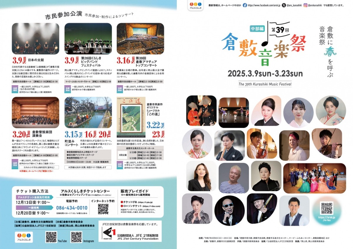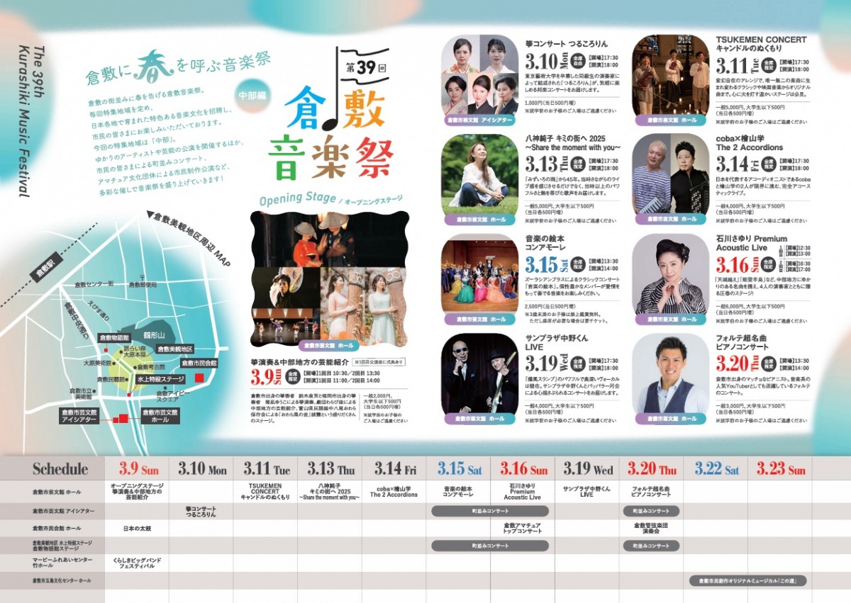 倉敷の街並みに春を告げる倉敷音楽祭。毎回特集地域を定め、日本各地で育まれた特色ある音楽文化を招聘し、皆様にお楽しみいただいています。今回の特集地域は「中部」。ゆかりのアーティストや芸能の公演を開催するほか、市民の皆様による街並みコンサート、アマチュア文化団体による市民制作公演など、多彩な催しで音楽祭が盛り上がります。