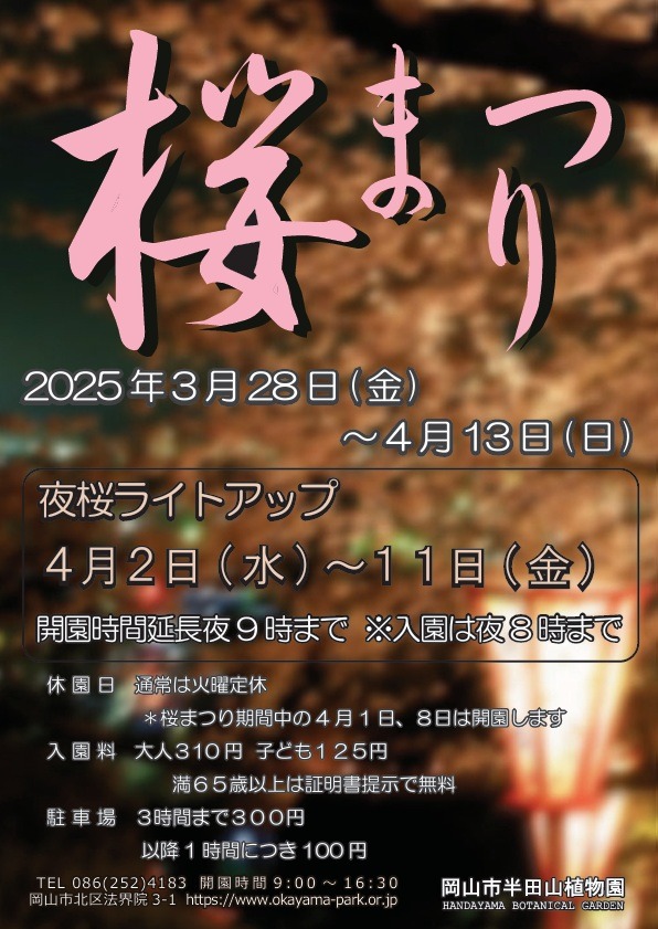岡山市の中心部からほど近い丘陵地にある半田山植物園で行われる桜まつり。満開時には山全体がピンク色に染まります。桜まつりの期間中は夜間ライトアップが行われます。