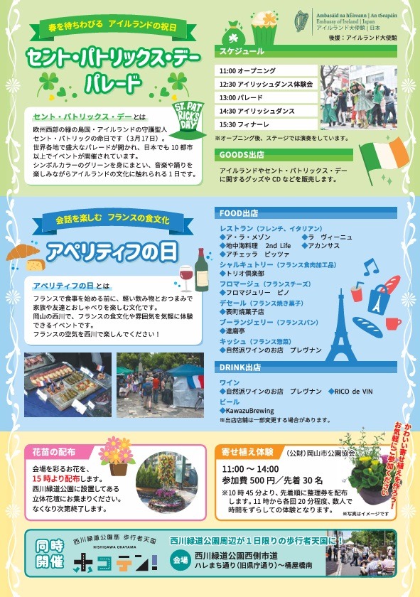 3月の花・緑ハーモニーフェスタin西川では、岡山のフランス料理店が提供する美味しい前菜やおつまみとワインが楽しめます。また、アイルランド音楽やアイリッシュダンスのステージも開催されます。緑豊かな西川緑道公園で、お洒落で楽しいひとときを過ごしてみませんか。花苗の配布や寄せ植え体験などもおこなわれます。