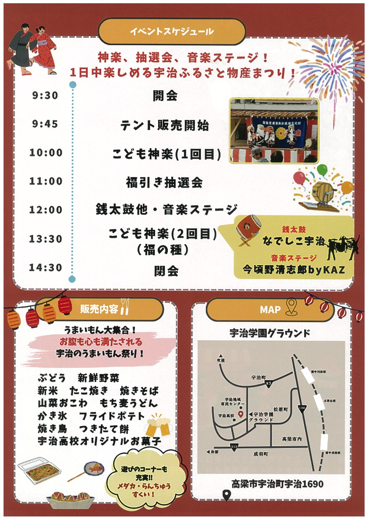 高梁市の宇治学園グランドにて「宇治ふるさと物産まつり」が開催されます。