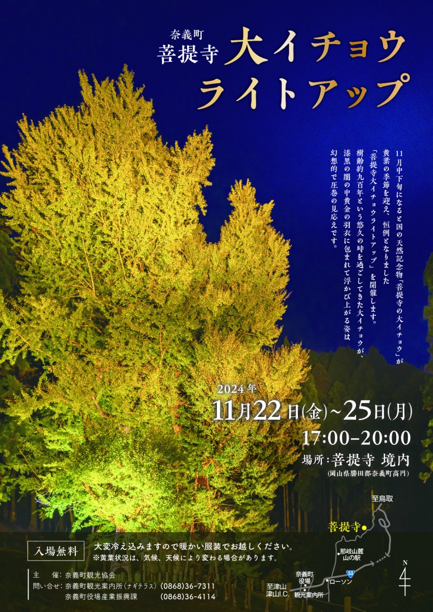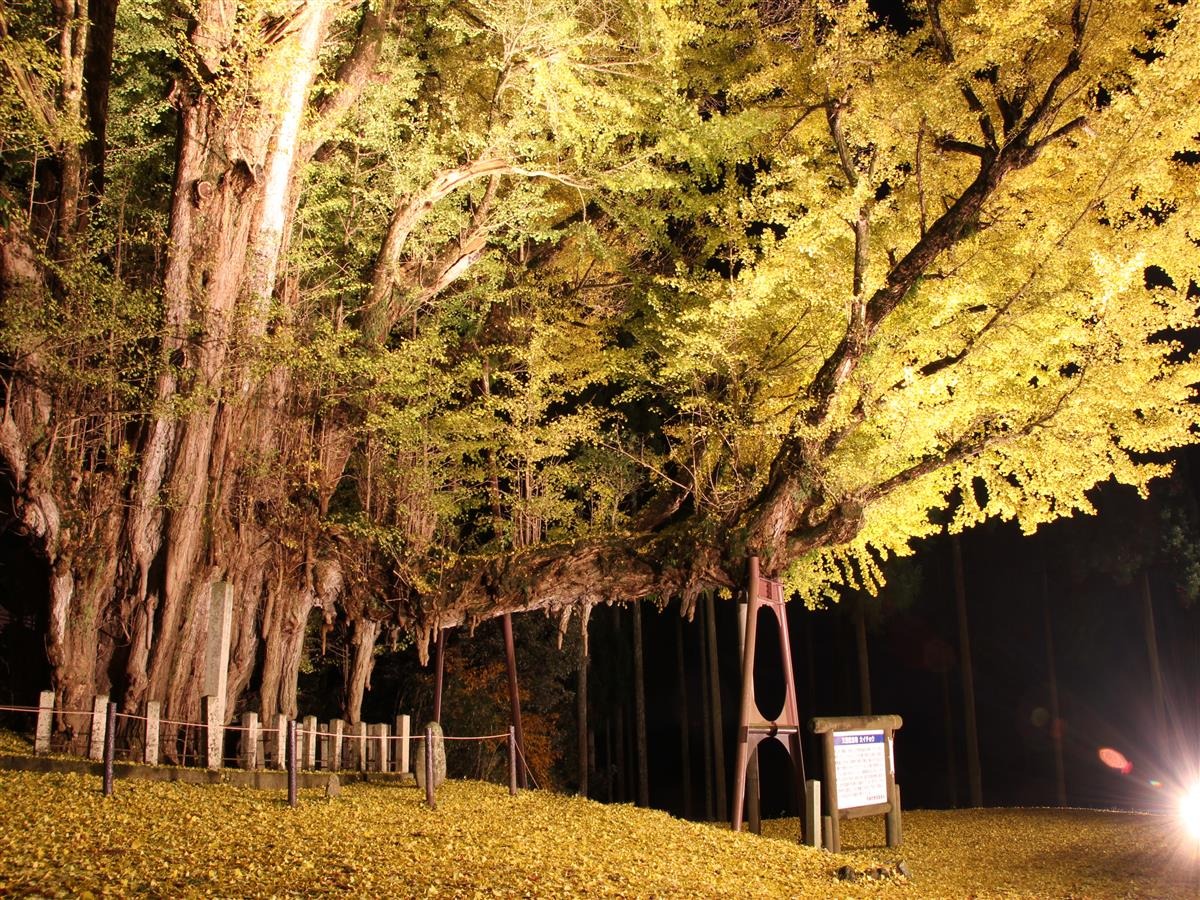 国の天然記念物「菩提寺の大イチョウ」が黄葉の季節を迎え、恒例となりました「菩提寺大イチョウライトアップ」が開催されます。樹齢約900年という悠久の時を過ごしてきた大イチョウが、漆黒の闇の中黄金の羽衣に包まれて浮かび上がる姿は幻想的で圧巻の見応えです。