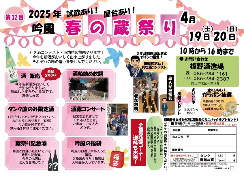 備中足守の地で江戸時代から変わらぬ佇まいの酒蔵「板野酒造場」にて、春の蔵祭りが開催されます。今年の「しぼりたて吟風」が飲めるほか、酒蔵の珍味、粕漬けや酒粕ピーナッツ、屋台コーナーなどの企画が盛り沢山です。