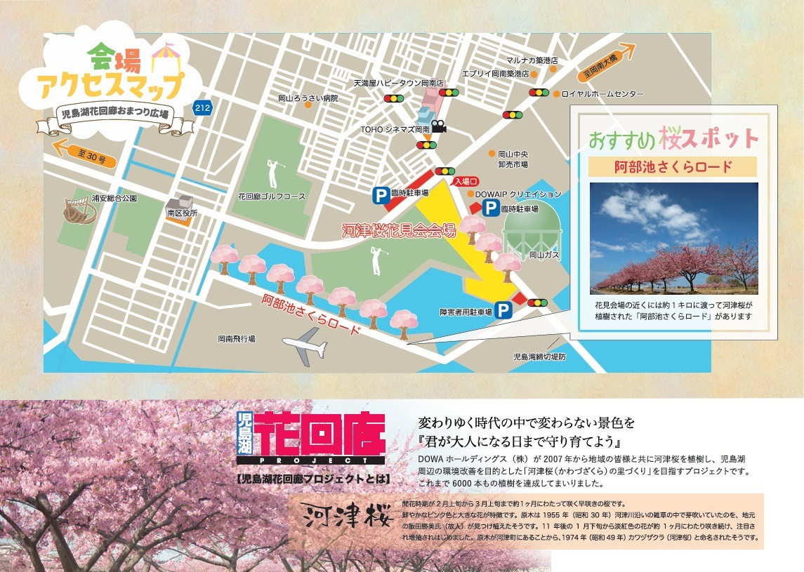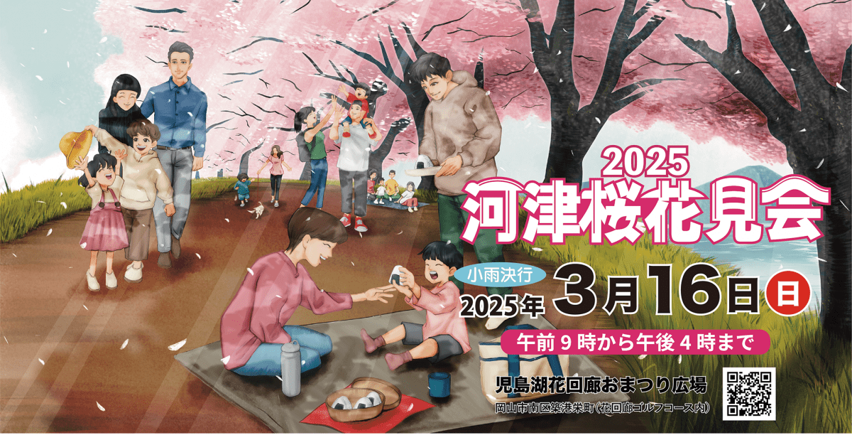 児島湖花回廊おまつり広場にて、河津桜花見会が開催されます。お弁当や飲み物、レジャーシートなども持ち込み可能。また、会場内ではバラエティー豊かなキッチンカーグルメもお楽しみいただけます。