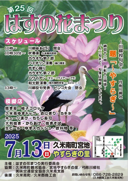 - 086-728-2829(はすの花まつり実行委員会【久米商工会 久米南支所】)