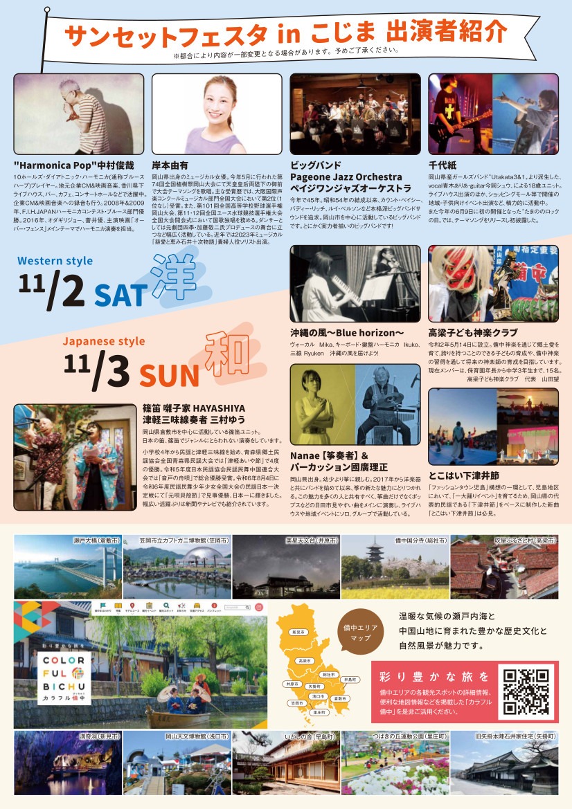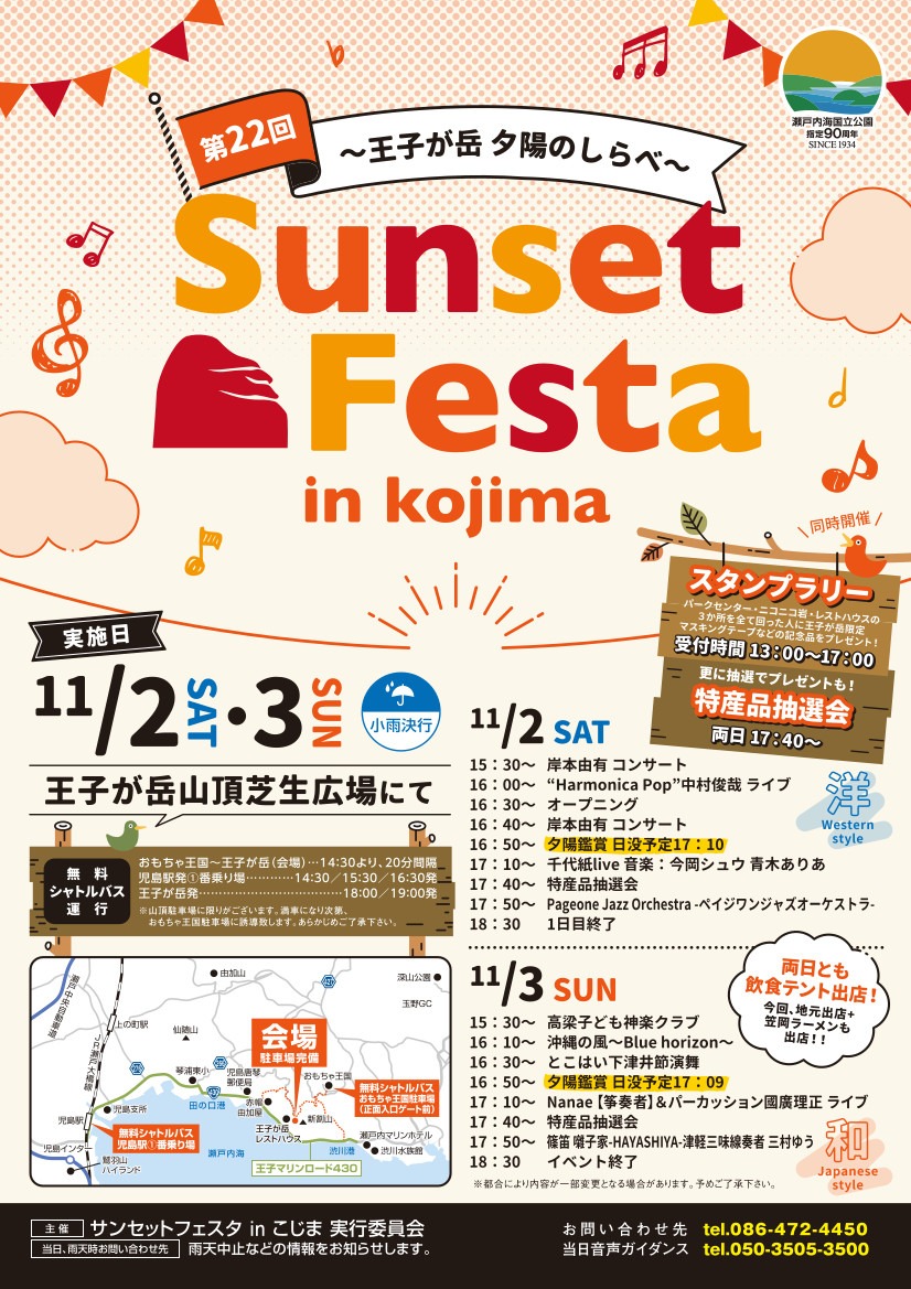 - 086-472-4450(サンセットフェスタ in こじま実行委員会)