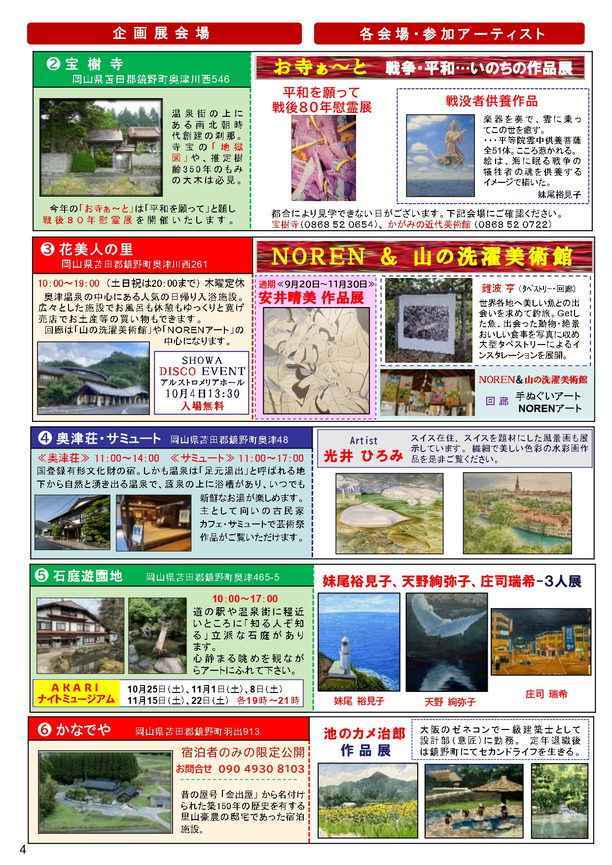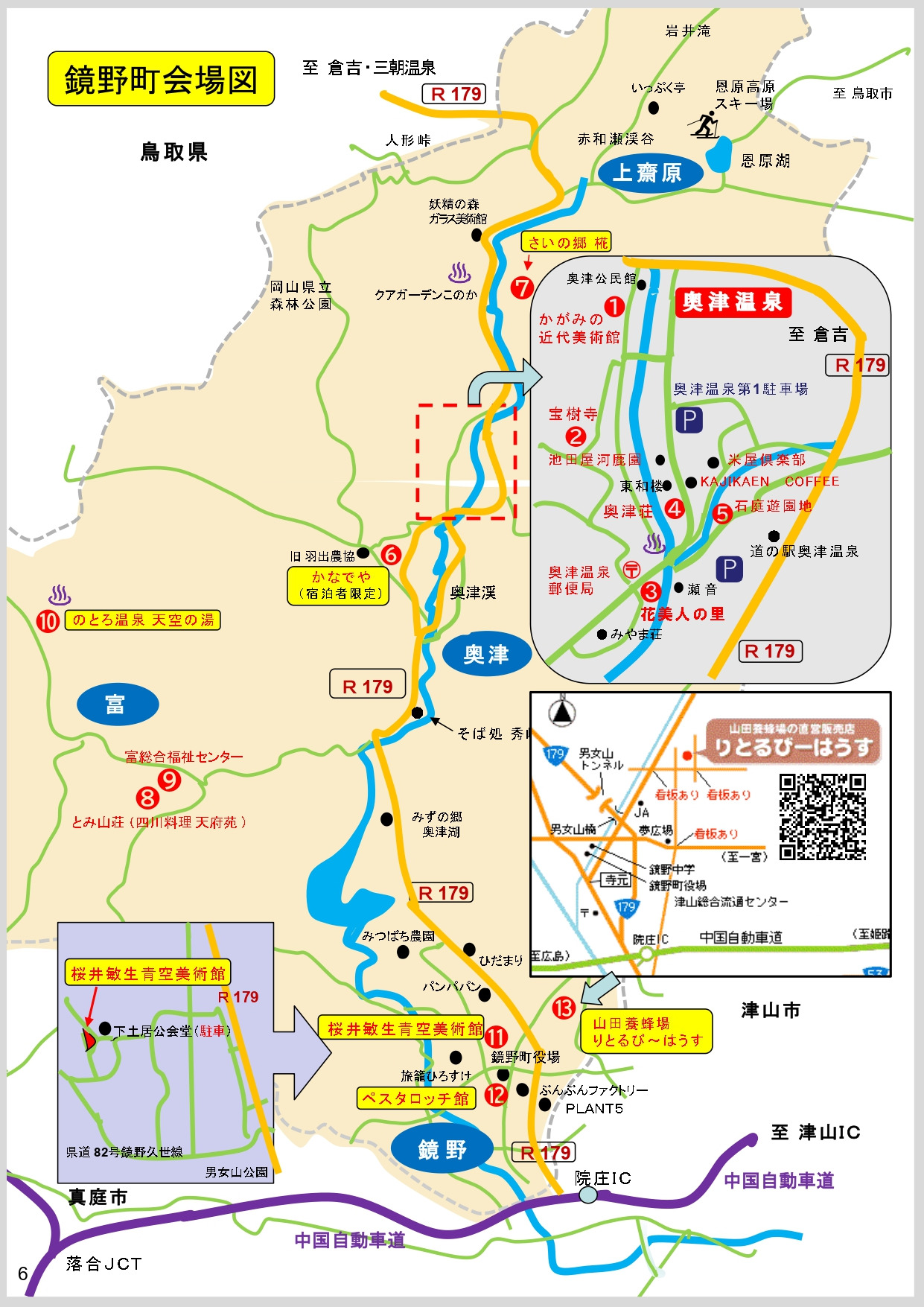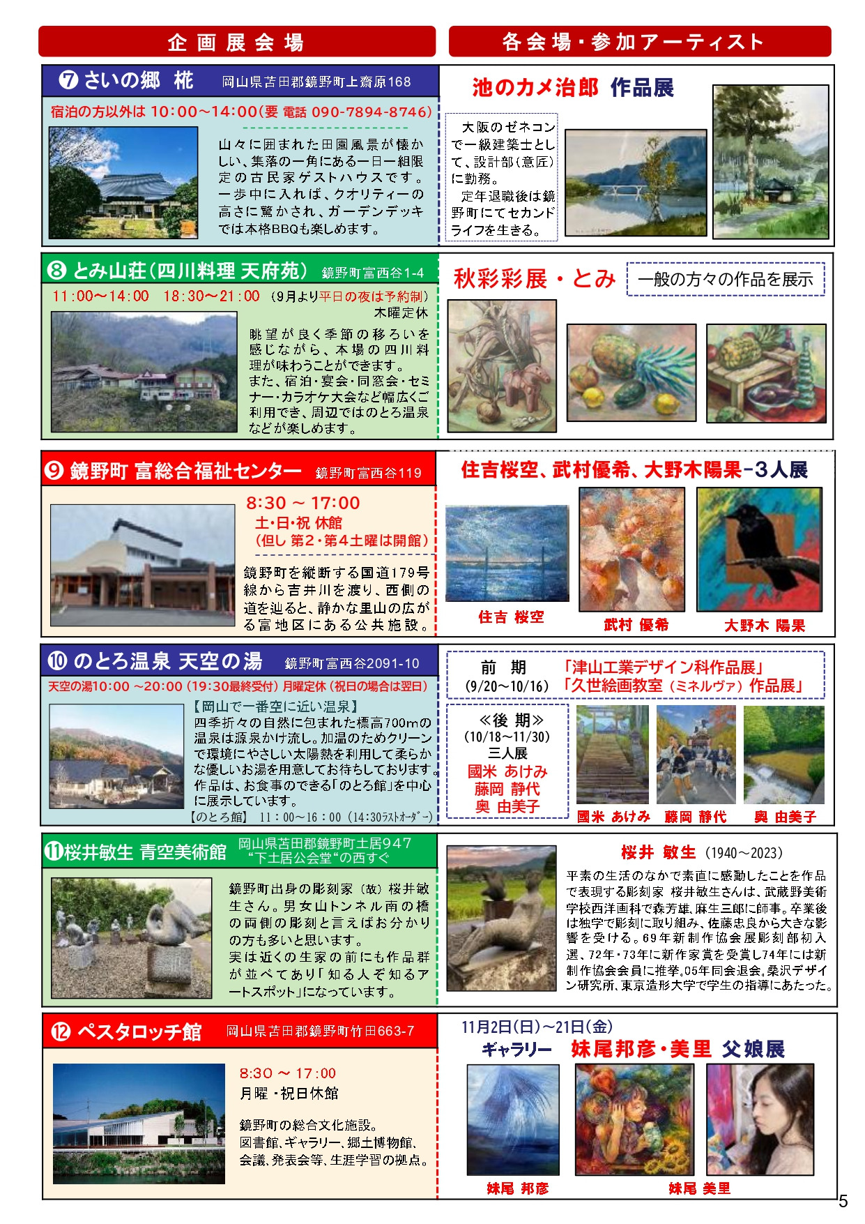 奥津温泉(鏡野町)を舞台に開催されるアートイベント。町内各エリア(奥津、鏡野、上齋原、富)のほか真庭市や津山市などの参加施設で、多彩な作家の作品が展示されます。