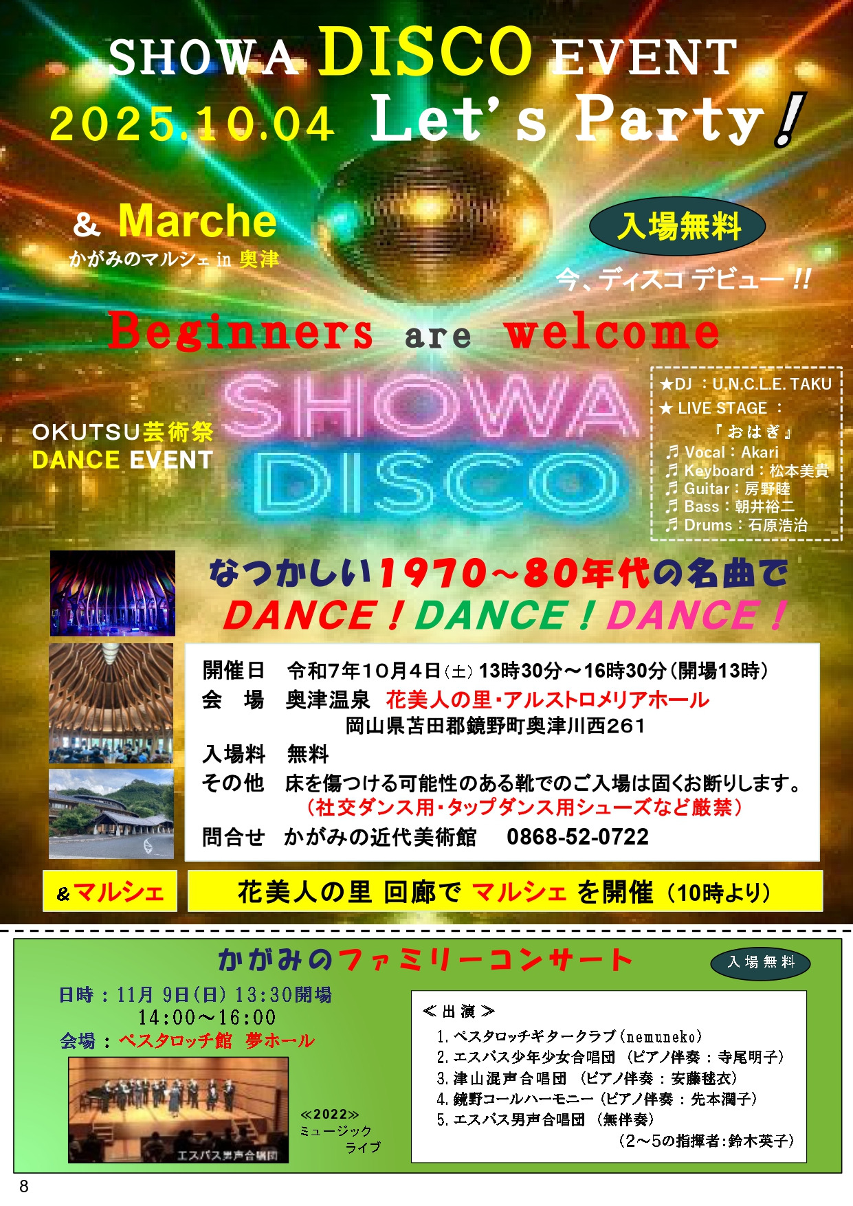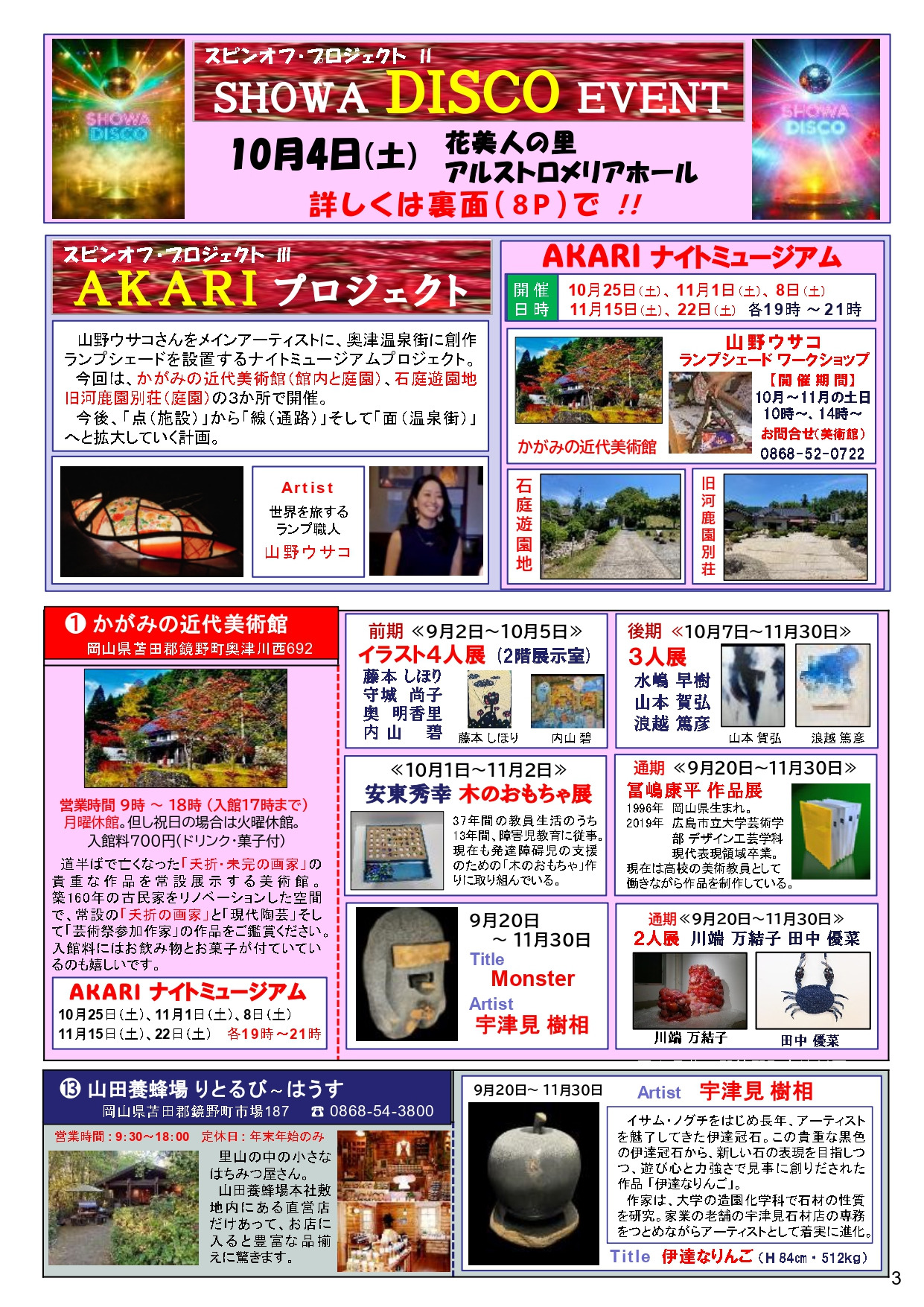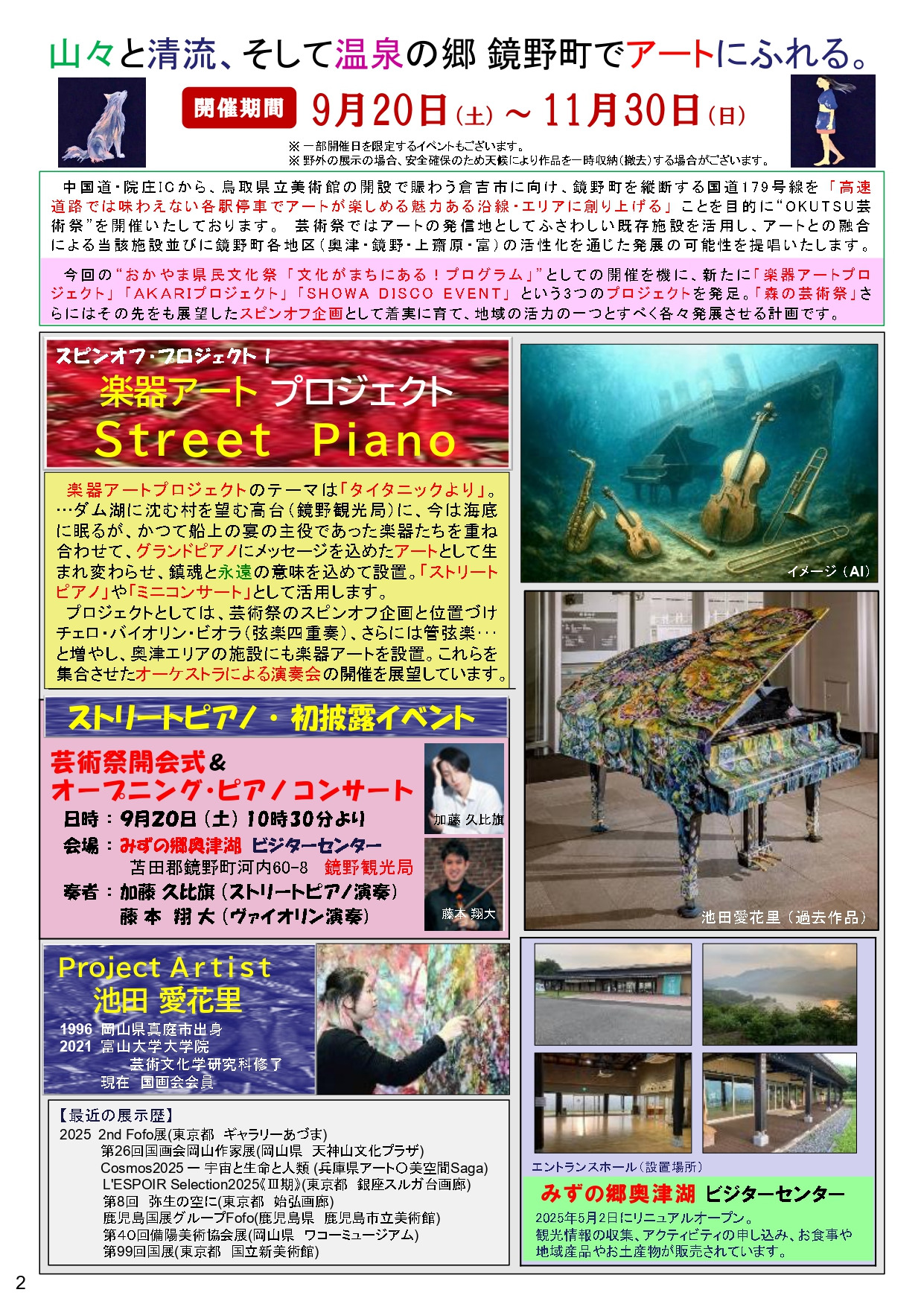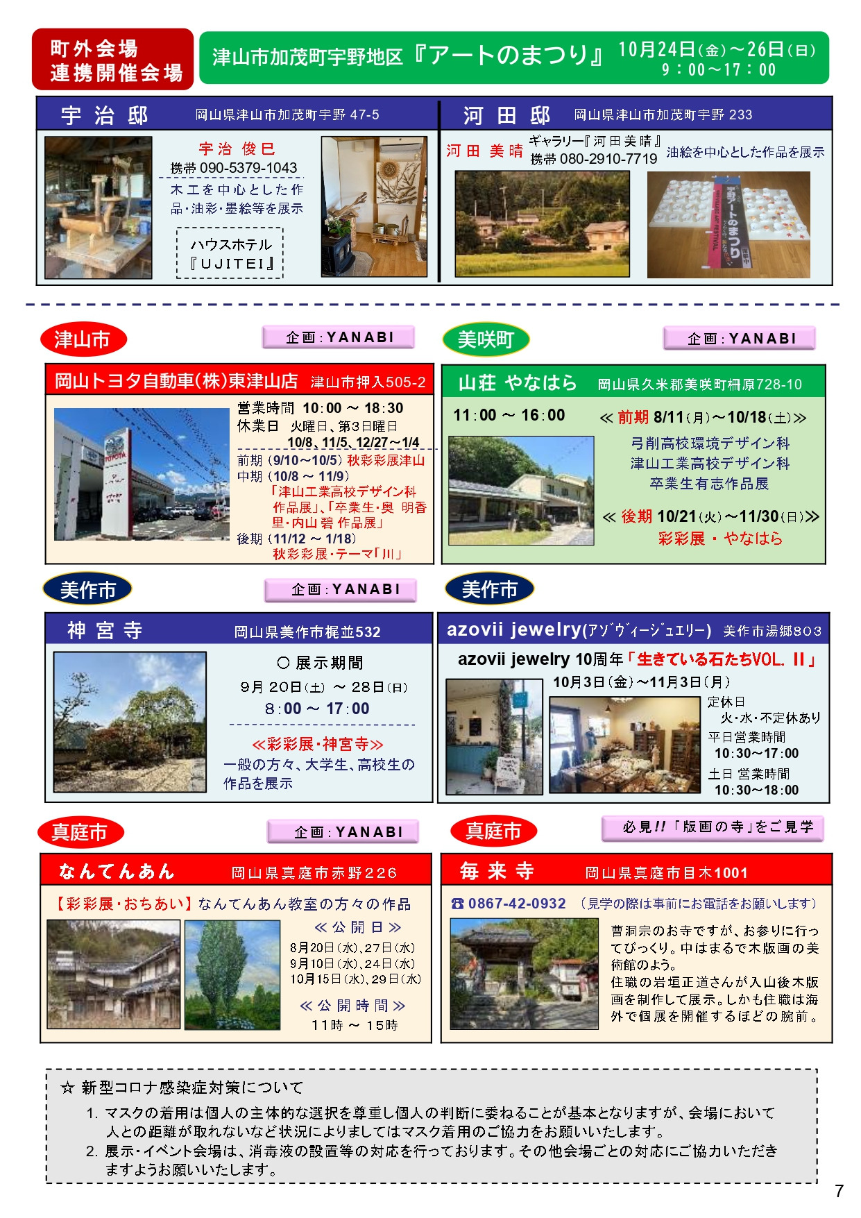奥津温泉(鏡野町)を舞台に開催されるアートイベント。町内各エリア(奥津、鏡野、上齋原、富)のほか真庭市や津山市などの参加施設で、多彩な作家の作品が展示されます。