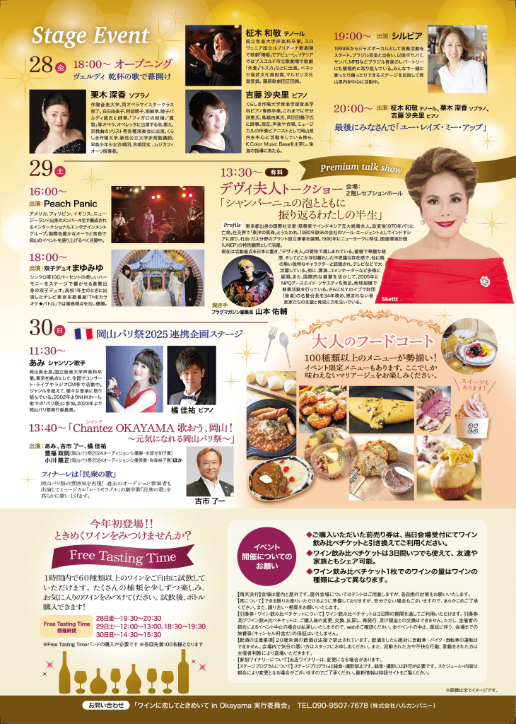 3月29日(土)にはデヴィ夫人が登壇し、「シャンパーニュの泡とともに振り返るわたしの半生」と題したプレミアムトークショーが開催されます(有料)。また、30日には【Chantez OKAYAMA 歌おう、岡山!~元気になれる岡山パリ祭~】と題した音楽ステージも行われます。