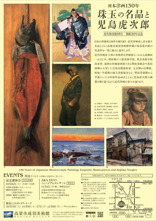 日本の洋画史130年を振り返り、近代洋画史に名を遺す画家の名品とともに館所蔵の児島虎次郎の代表作が一堂に展示されます。近代洋画史上初の本格的な洋画家といわれる高橋由一をはじめ、黒田清輝が主宰した白馬会関連作家、大正期の白樺派メンバー、昭和・平成期の独立美術協会メンバーなど明治から平成にいたる作家作品約40点と児島虎次郎の画業を併せて振り返りながら近代洋画の歩みを感じてください。