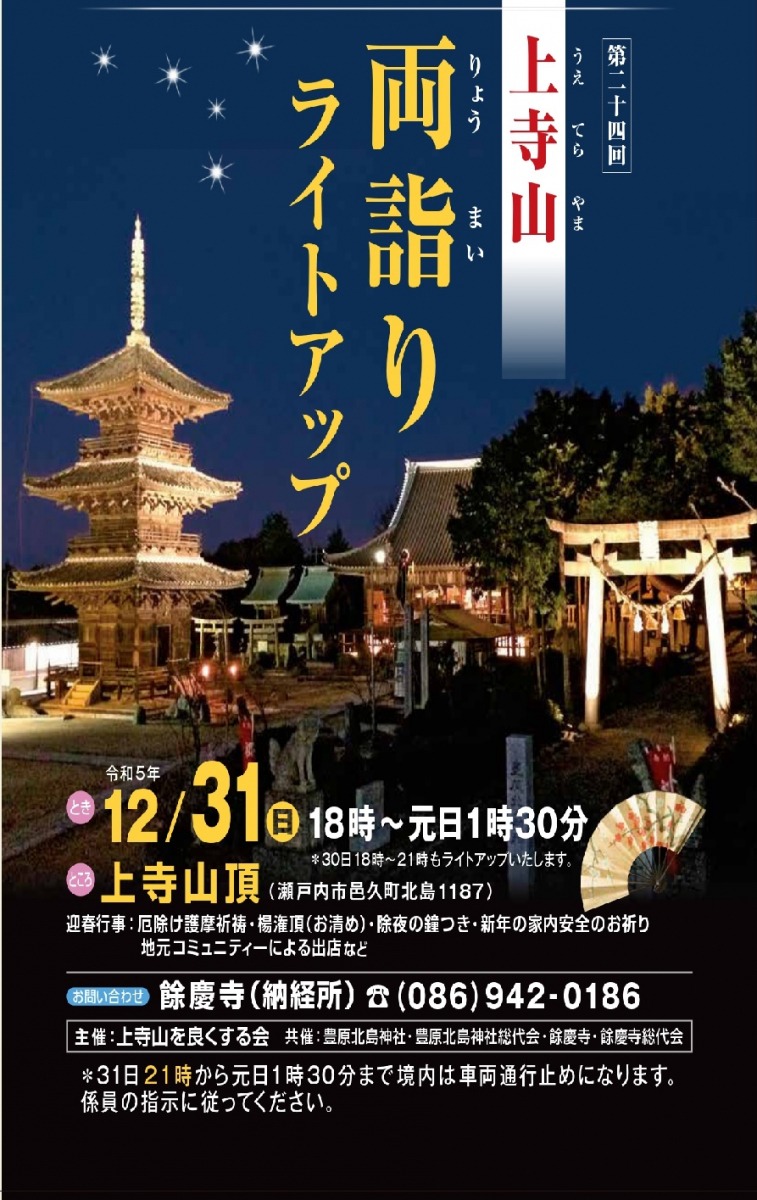 上寺山餘慶寺の迎春行事で、厄除け護摩祈願や除夜の鐘つき、家内安全のお祈りのほか、地元コミュニティによる出店や境内のライトアップなどが行われます。