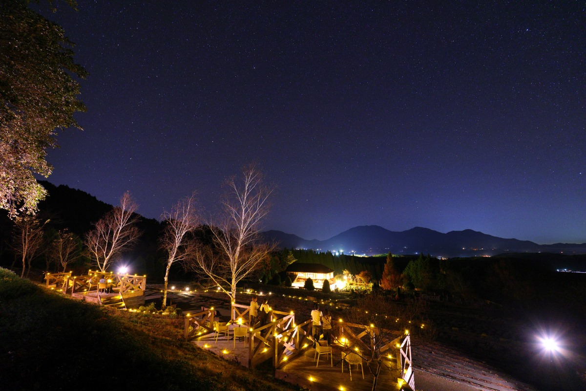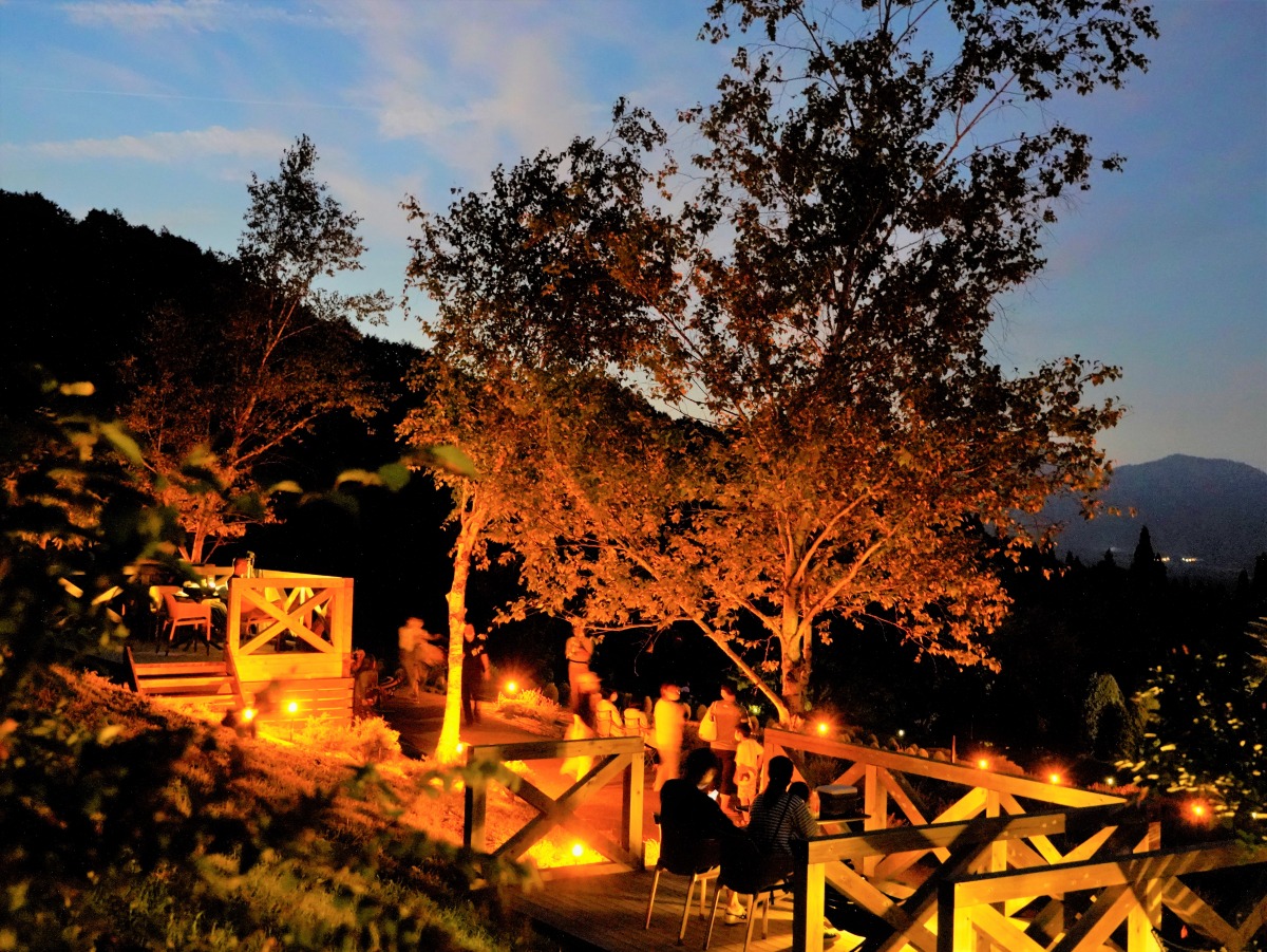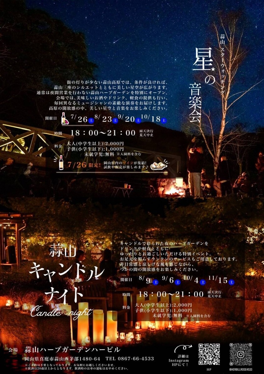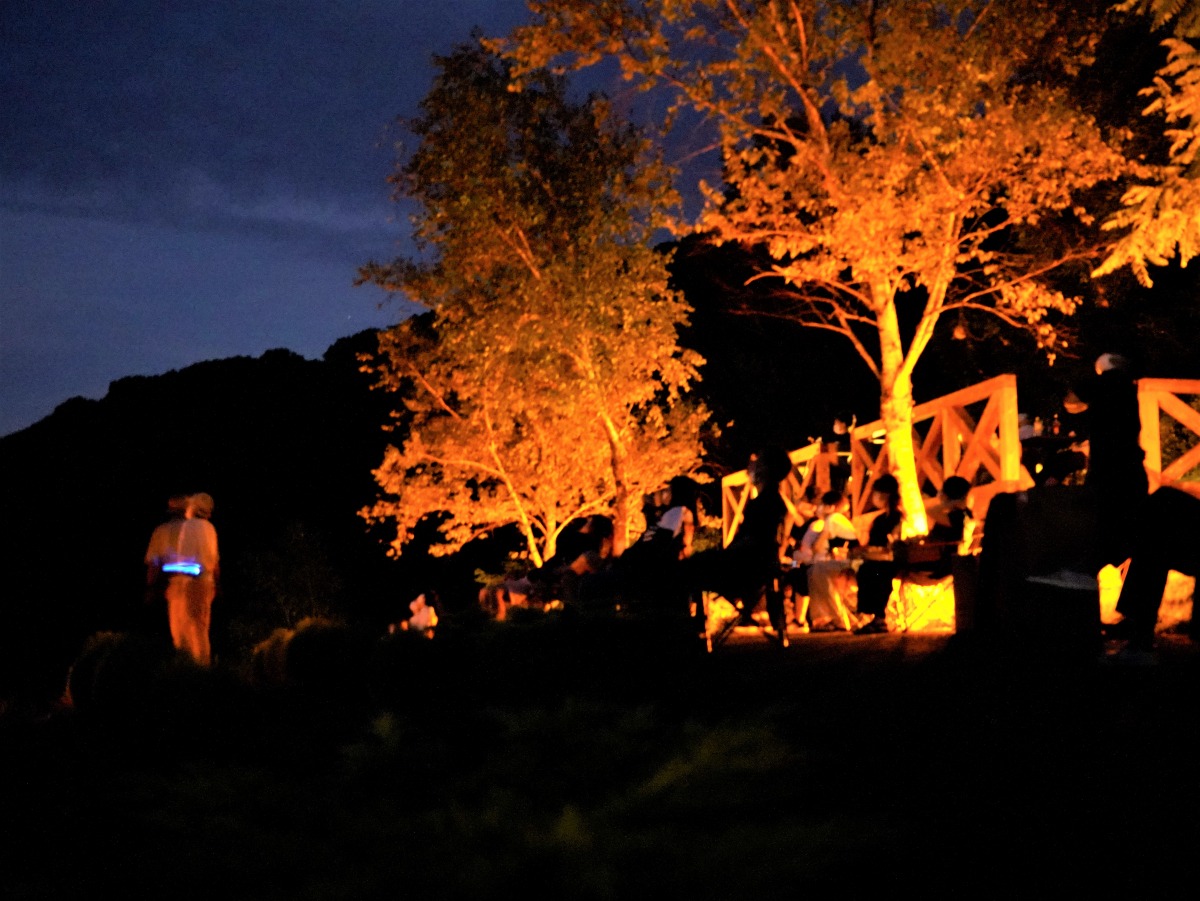 通常は夜間営業を行わないハーブガーデンを特別にオープンし、開放感ある雰囲気の中、星空の解説が聞ける特別なナイトイベントです。周囲を山に囲まれ街の灯りが少ない蒜山高原は天体観測に最適!
