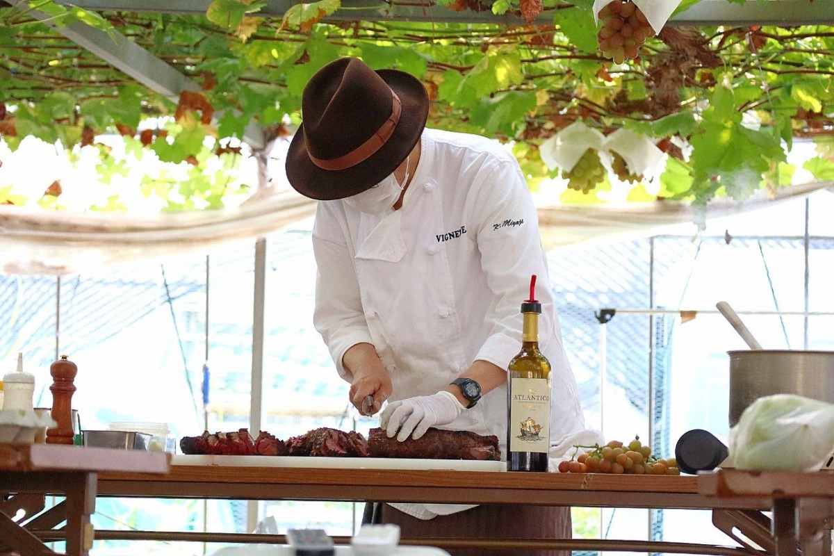 調理法を変えてさまざまな味を楽しんでもらう「ぶどうのデグリネゾン」を提供。とれたてのぶどうを使ったライブクッキングも披露。