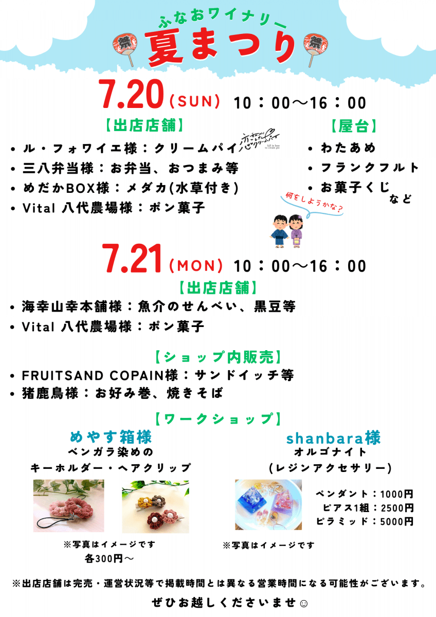 ふなおワイナリーにて「夏まつり」が開催されます。地元で有名なお店の出店をはじめ、子供から大人まで楽しめる屋台やワークショップなど盛りだくさん。7月に販売を開始した新商品のカップアイスやロゼスパークリングワイン(通常700円→500円)も販売されます。