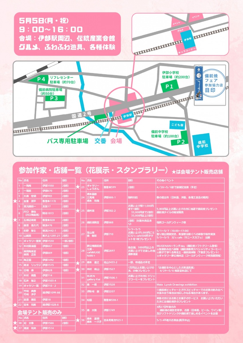 メインイベントは5月5日(月・祝)に開催され、飲食ブースや体験コーナー、備前焼販売などお楽しみ企画が盛りだくさんです。
