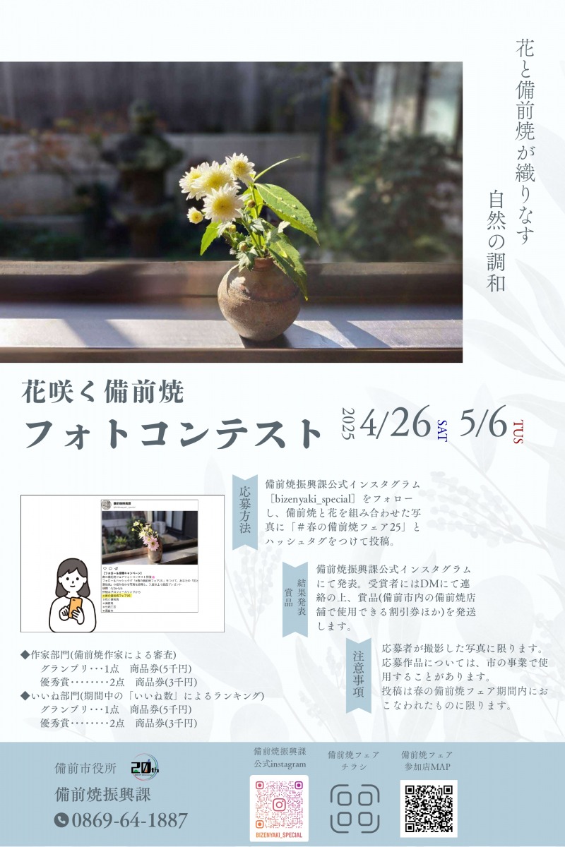 インスタグラムに備前焼と花を組み合わせた写真を投稿。後日、グランプリや優秀賞が発表されます。(賞品あり)