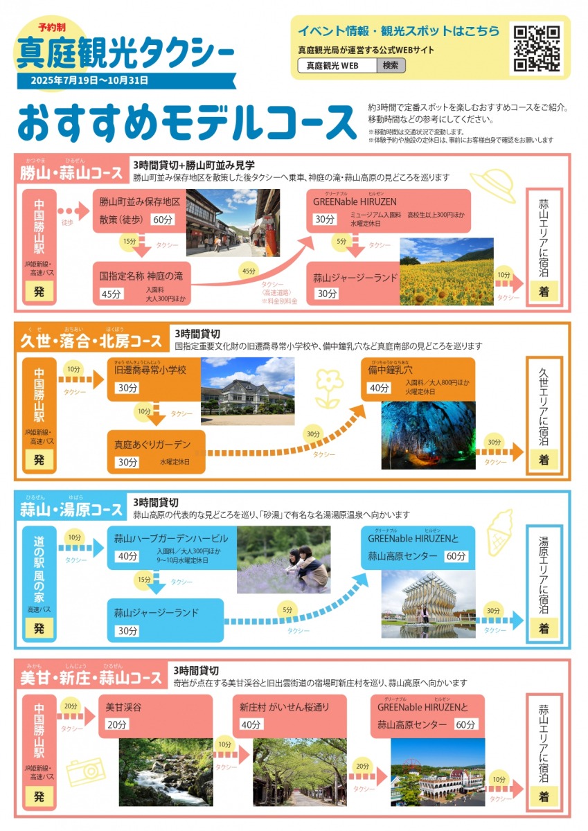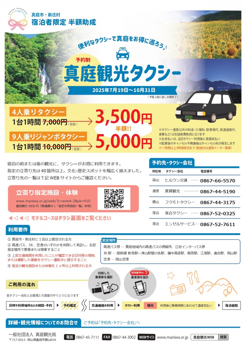 宿泊の前または後の観光に、 真庭市・新庄村を巡るタクシーがお得に利用できます。