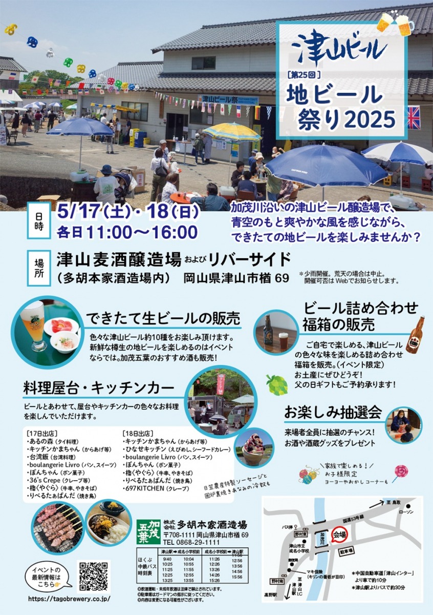 津山市の加茂川沿いに位置する津山ビール醸造場を会場に開催される地ビールイベント。出来たて生ビール販売はもちろん、津山餃子や津山黒豚ソーセージなどおつまみにぴったりのキッチンカーなど料理屋台も充実。この日だけの、色々な味を楽しめる詰め合わせ福箱もあります。青空のもと爽やかな風を感じながら地ビールを楽しめます。