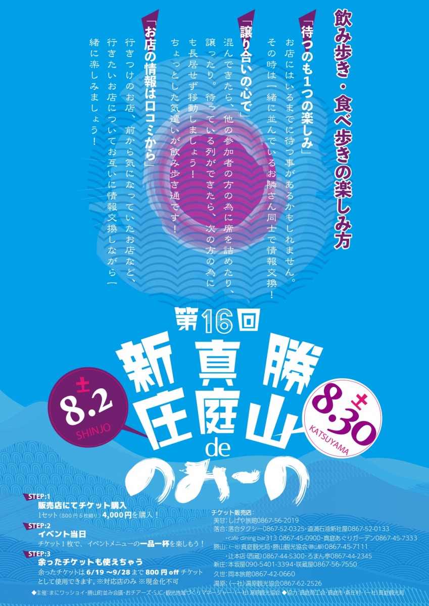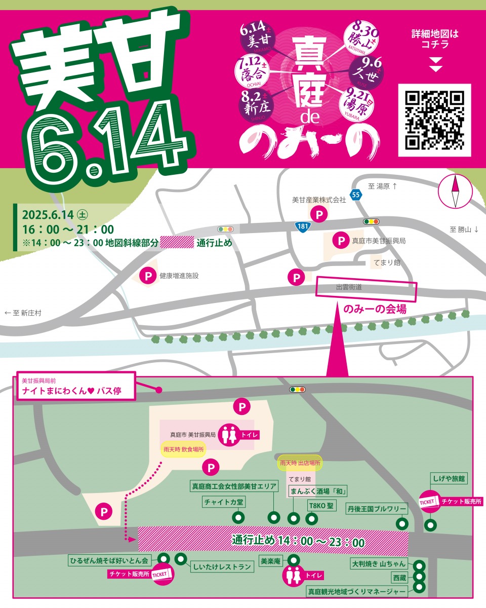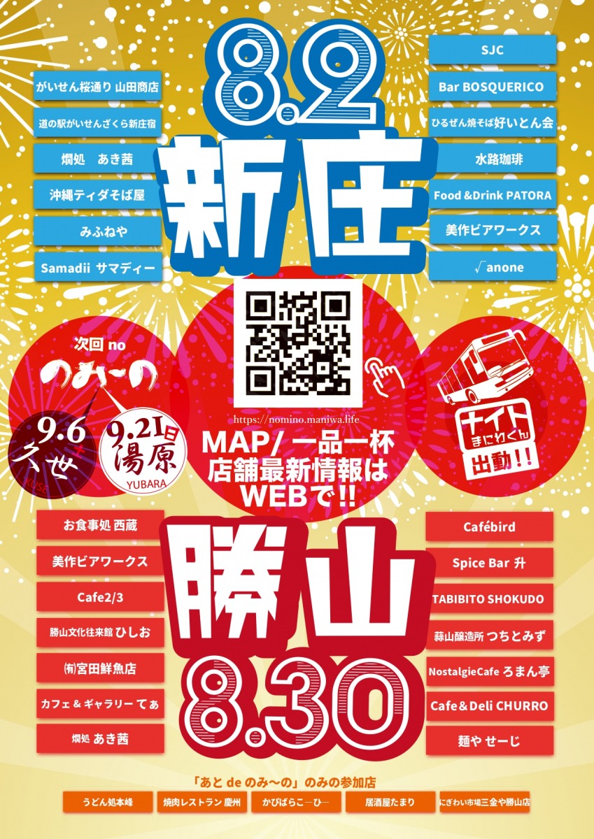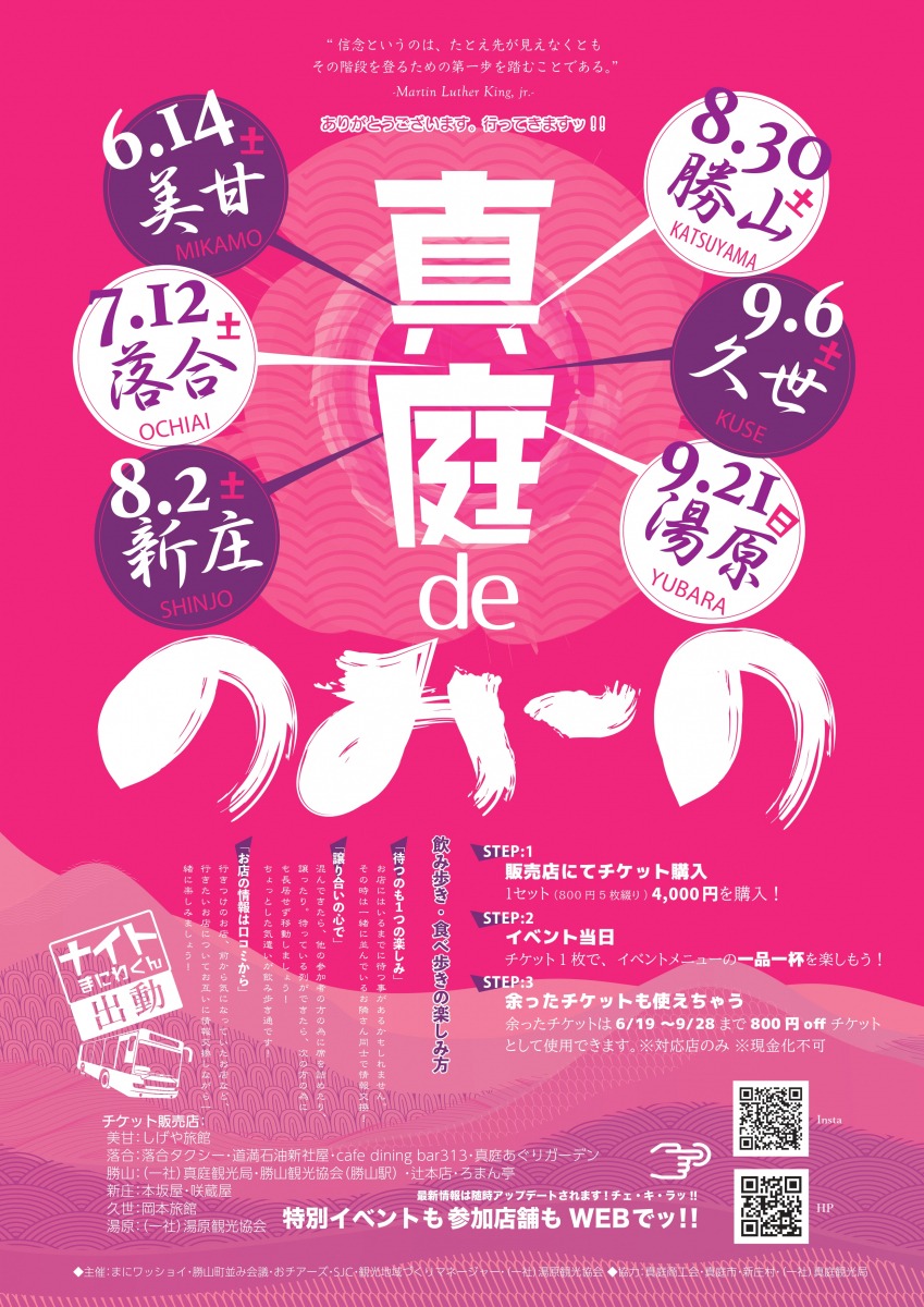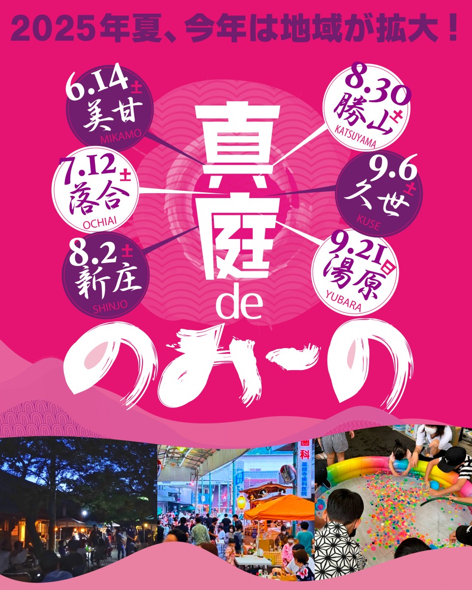 真庭の飲み歩きイベント。今年から「真庭deのみ~の」と題し、新たに美甘・湯原が加わりました。6月~9月にかけて順番に、美甘・落合・新庄・勝山・久世・湯原の6エリアで開催されます。真庭市の協力でコミュニティバスまにわくん♡の夜間運行「ナイトまにわくん♡」も運行されます。※時刻表は公式サイトをご確認ください。