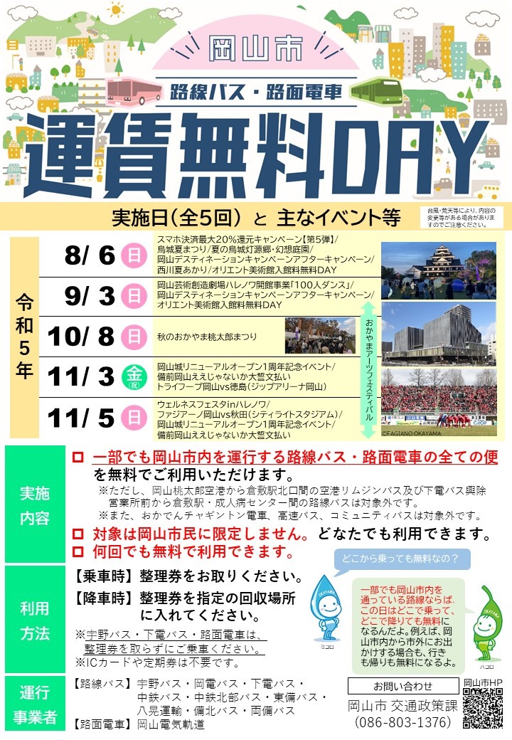 ・一部でも岡山市内を運行する路線バス・路面電車の全ての便を無料化。