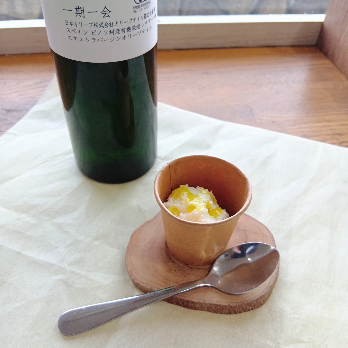 ①「83年おめでとう!」の合言葉を言うと、ミニアイス×オリーブオイルのプレゼントがあります。※先着50名