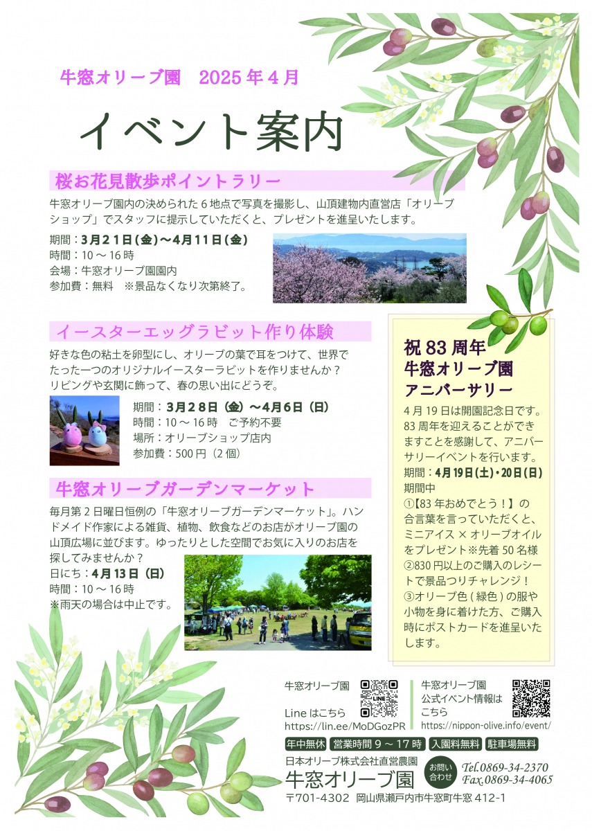 牛窓オリーブ園は1942年4月19日に開園して83周年を迎えます。アニバーサリー期間中には様々な特典があります。