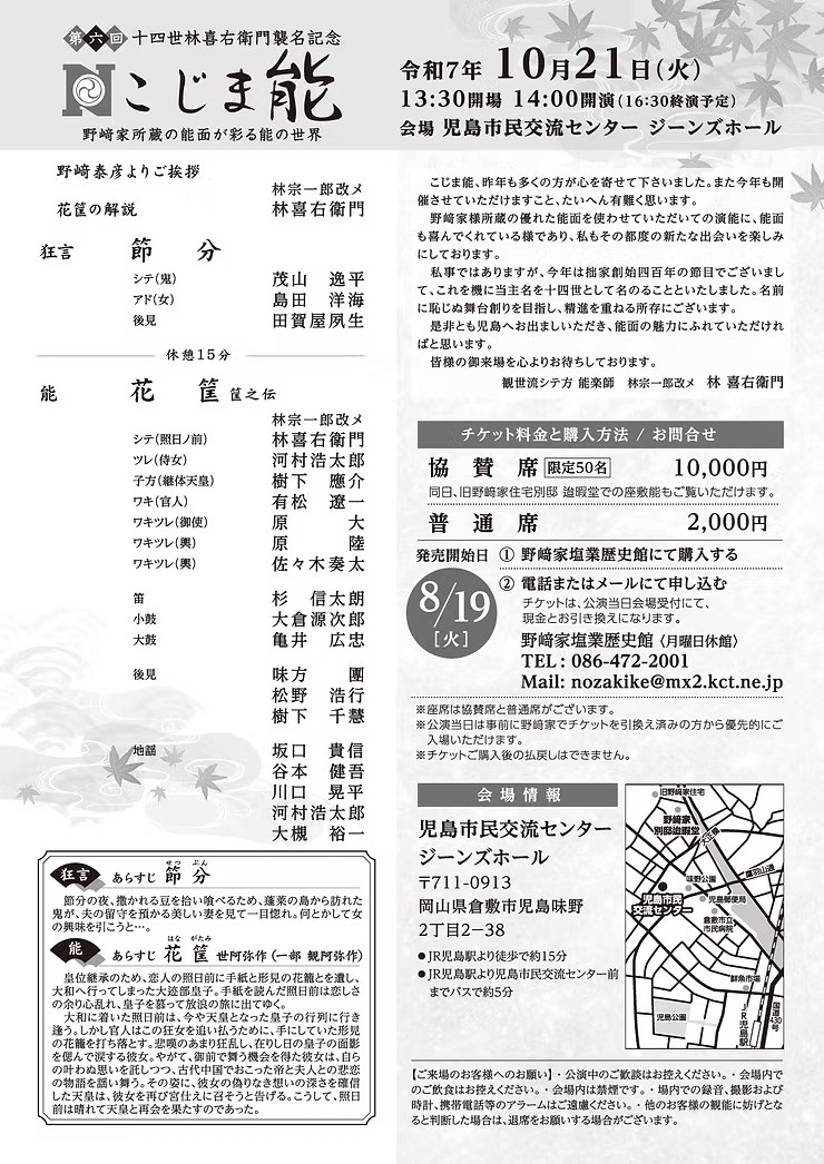 室町時代の古作、また岡山藩池田家より拝領した品として代々守り伝えられてきた野﨑家所蔵の能面。2017年に能楽師・林宗一郎氏による岡山ゆかりの能「吉備津宮」復曲に際し、野﨑家の面が用いられ、以後毎年貴重な面を使った「こじま能」が開催されています。会場は「児島市民交流センタージーンズホール」です。※協賛席の方は、同日の「野﨑家別邸 迨暇堂」での座敷能も鑑賞できます