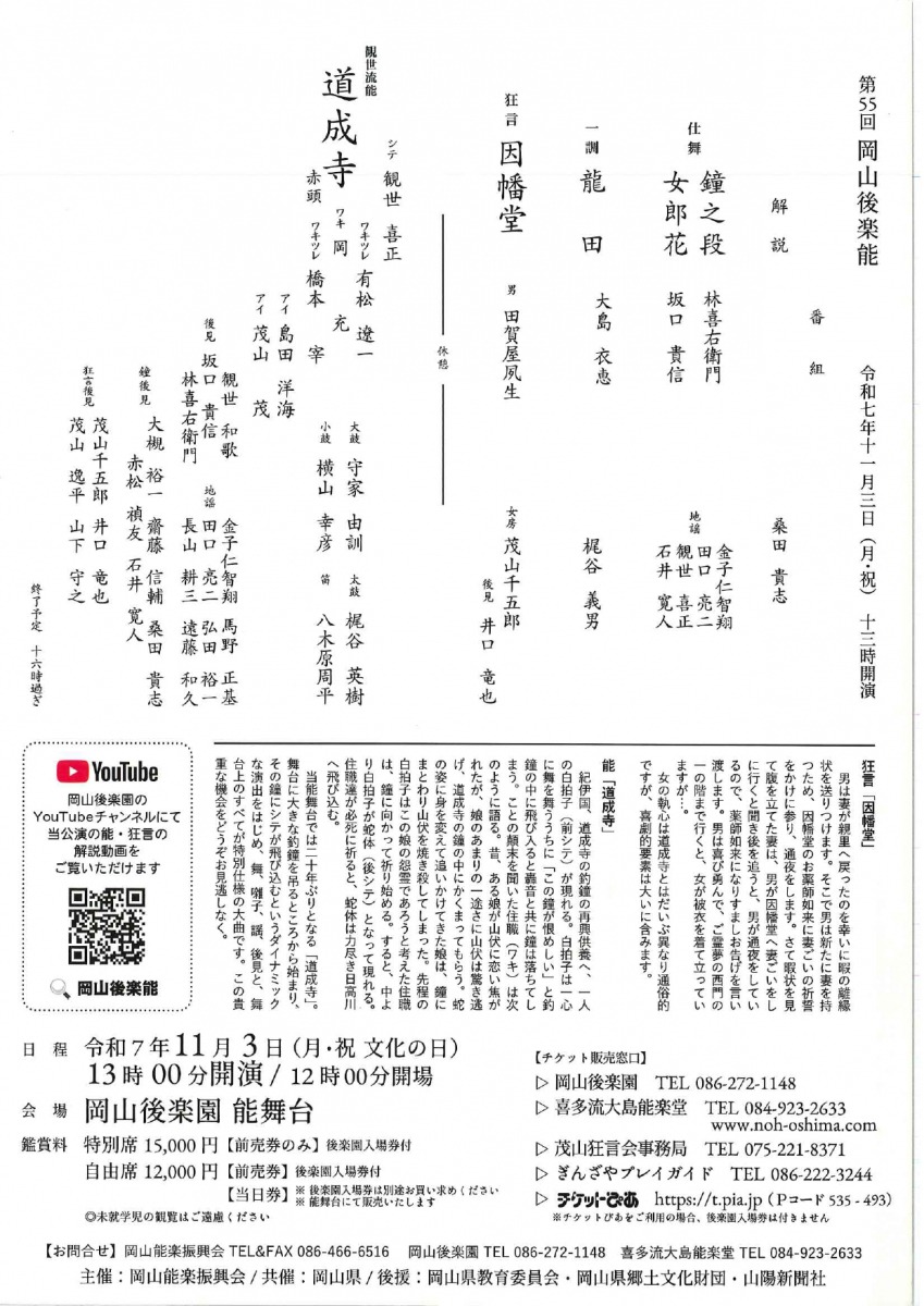 江戸時代の趣を今に伝える後楽園の能舞台で能楽に親しんでもらうため、毎年開催されている鑑賞会です。
