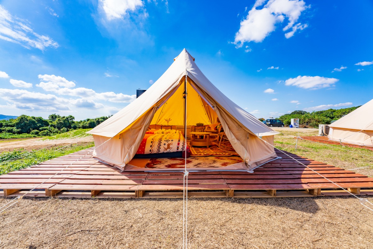 倉敷駅から車で15分の立地にありながら、視界いっぱいに広がる空と、開けた景色が一望できるグランピング施設。
