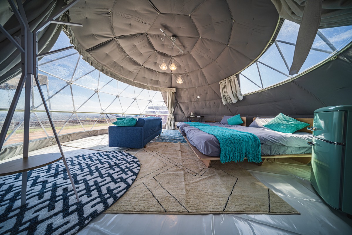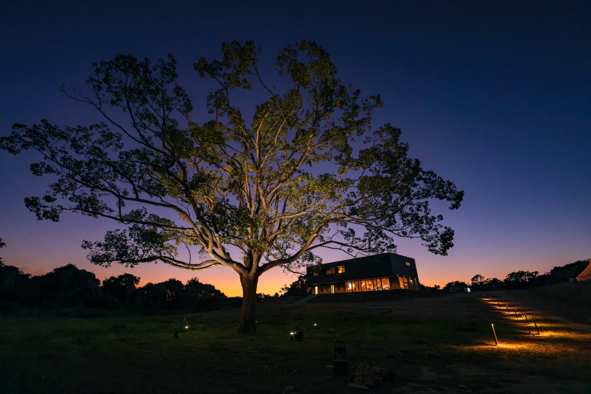 敷地内にはカフェ併設の本棟、グランピングテント、ドームテント、キャンプ用の区画サイトがあり、夜景を見ながら夕食のBBQが楽しめるような施設となっています。