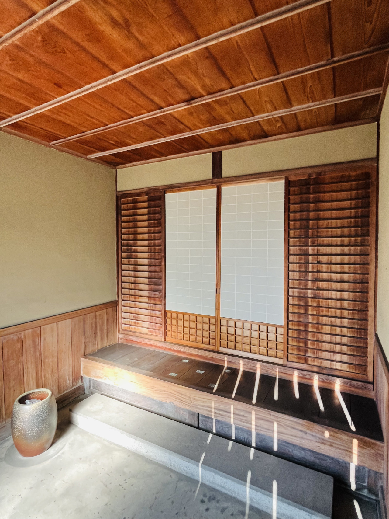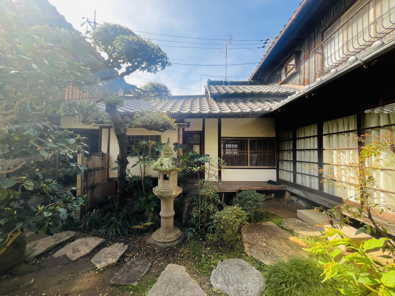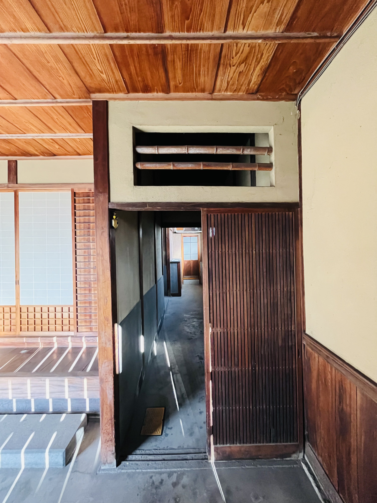 約300平方メートルの敷地を囲むのは、伝統的な「焼杉板」の外壁。大正期の裕福な商家の象徴である「虫籠窓(むしこまど)」や、深く突き出した「出桁造(だしげたづくり)」が、道行く人にその格式の高さを静かに物語ります。