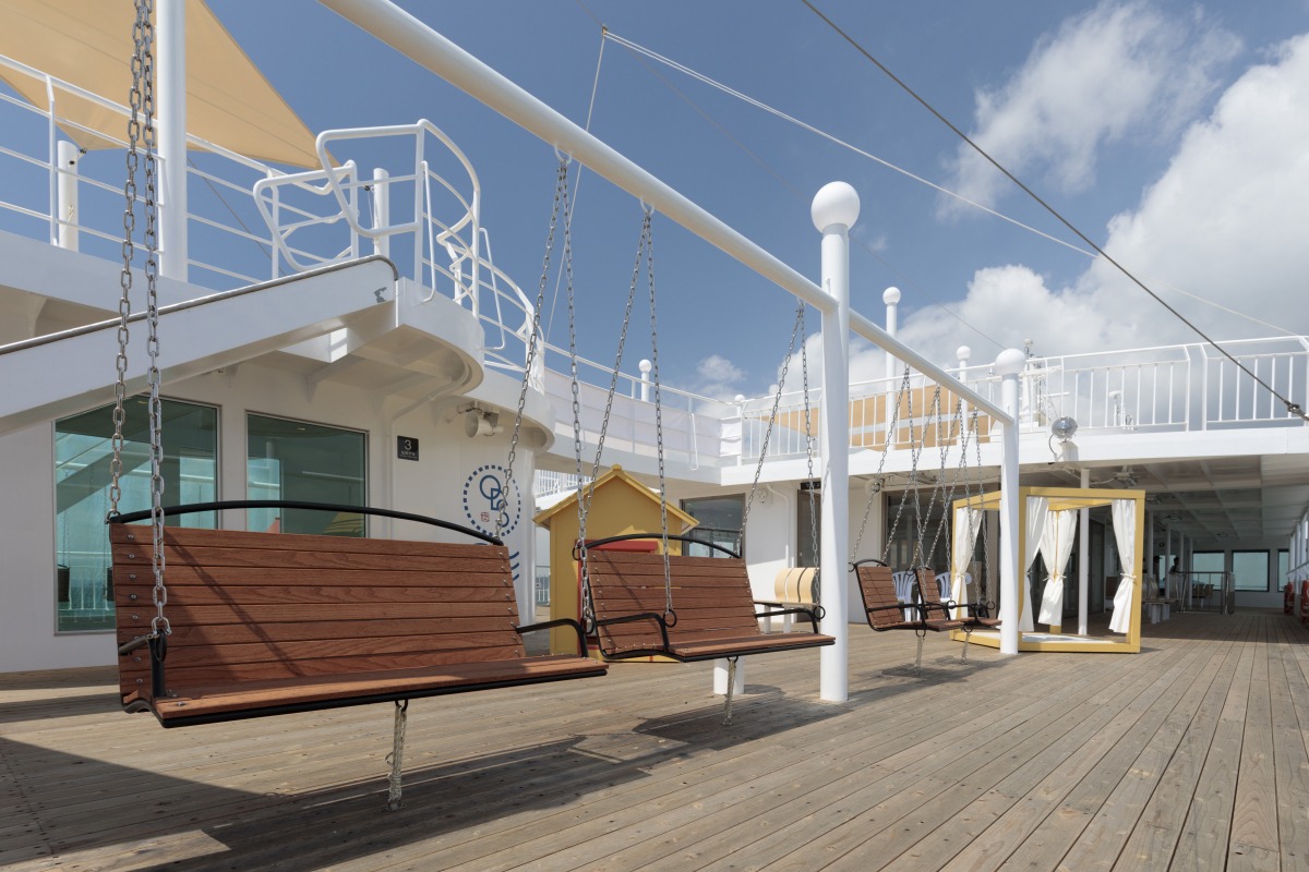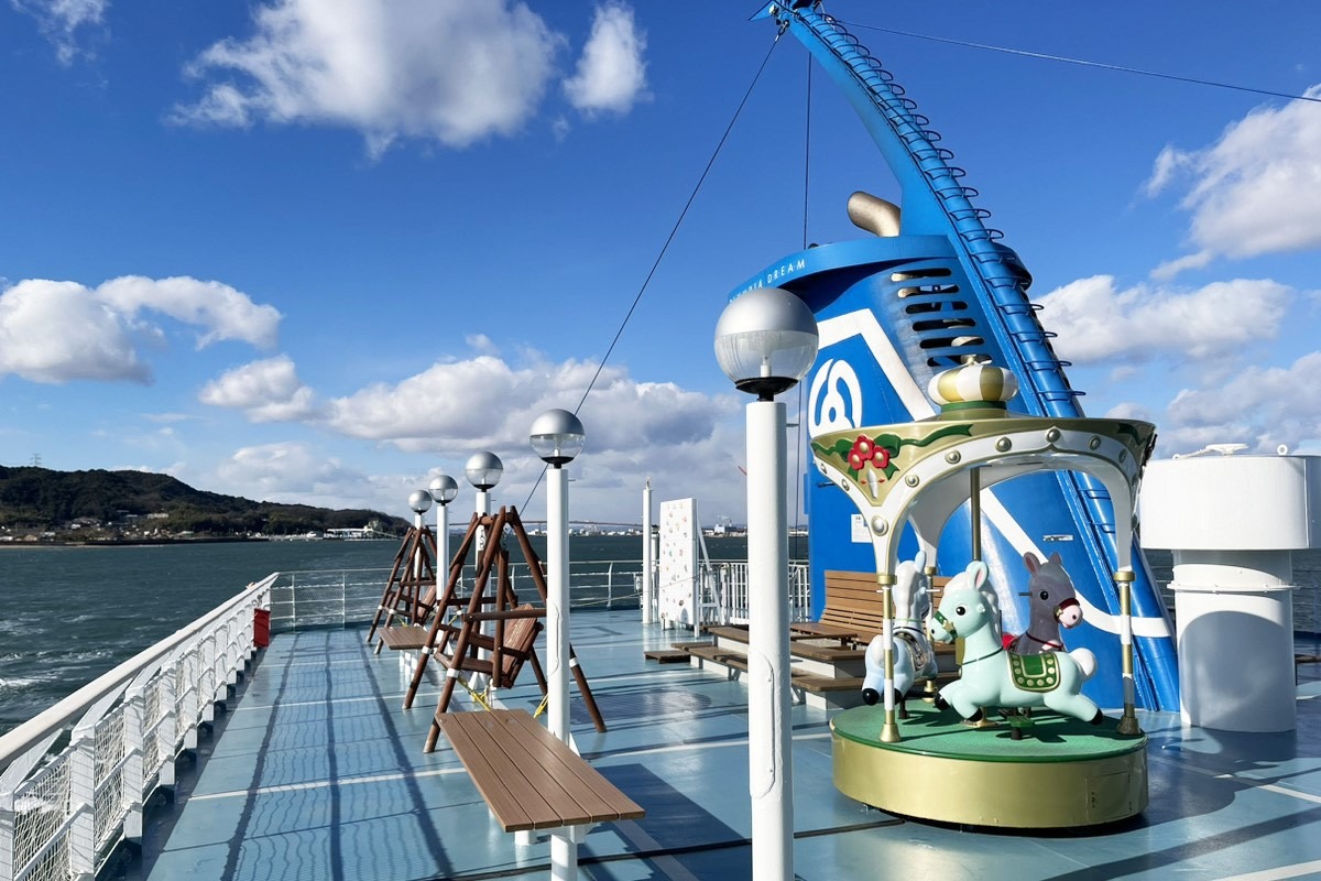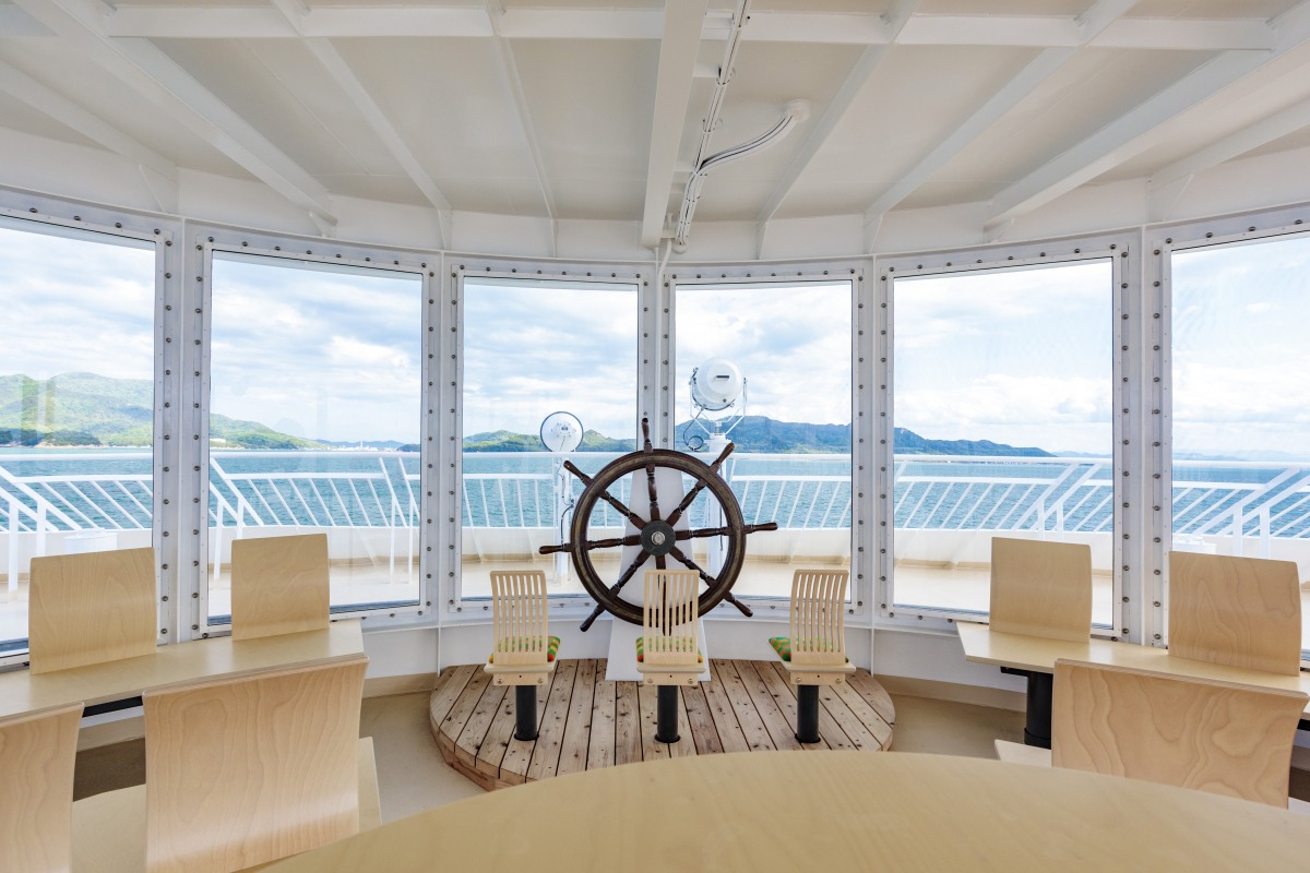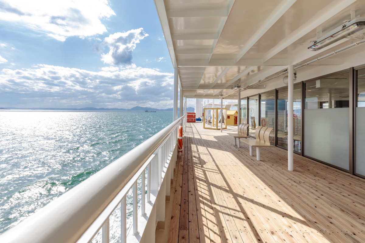 明るく開放感のあるデッキからは、美しい瀬戸内海をお楽しみいただけます。デッキにはブランコもあり、フォトスポットとしても大人気! 客室内にはオーシャンビュー席や展望個室も備えています。