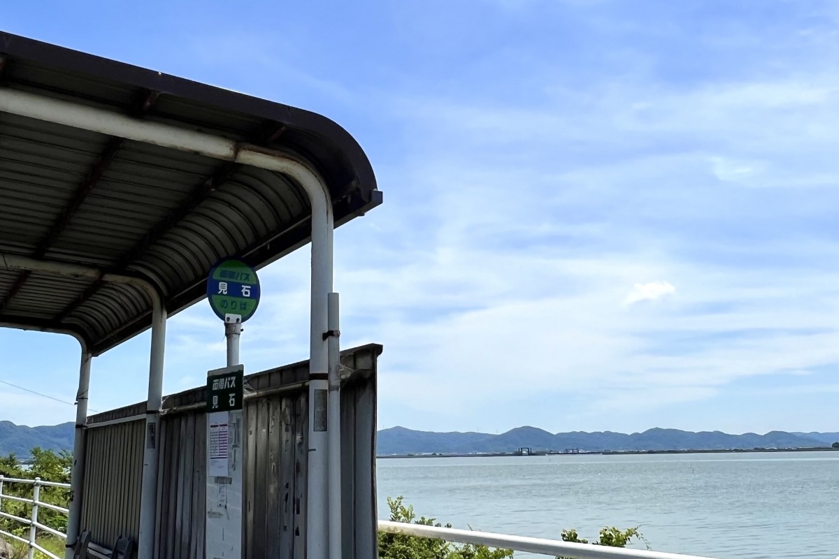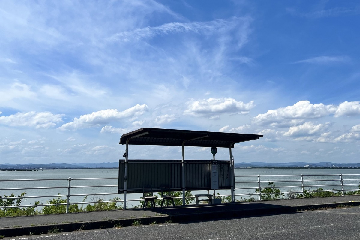 児島湖沿いを走る県道45号線に設置されたバス停。映えスポットとしてSNSにもしばしば投稿されています。晴れた日の夕景もステキです。