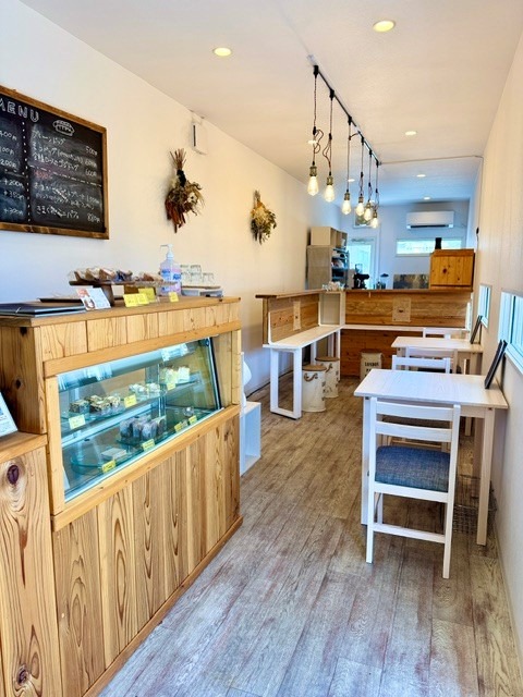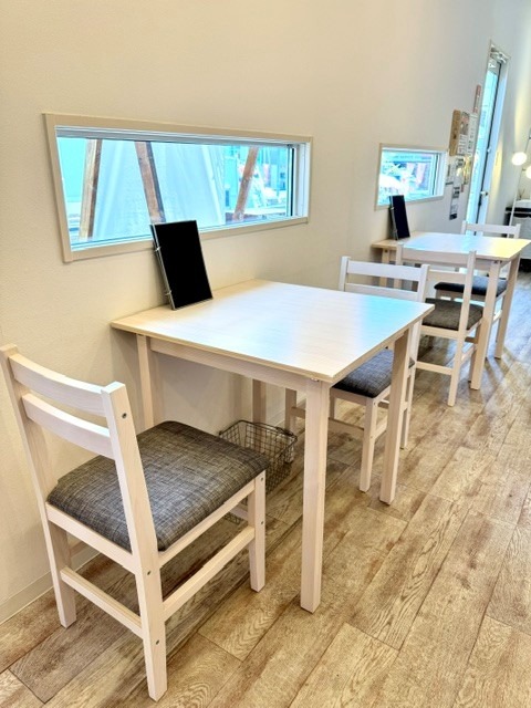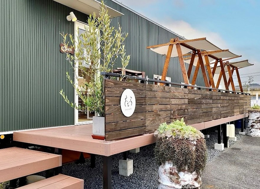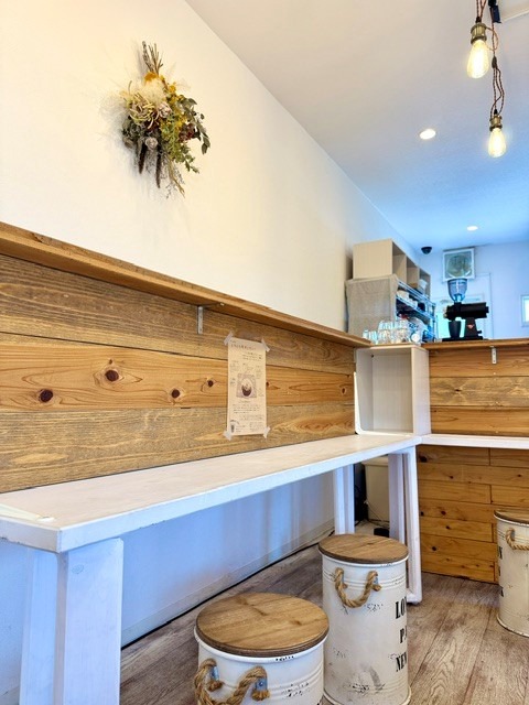 敷地内には、緑色のトレーラーハウスを活用した「そらcafe」があり、白と木目を基調としたナチュラルで温かみのある空間が広がっています。こじんまり、隠れ家的な場所です。カフェシーンや対談、スチール撮影など、様々なシチュエーションに対応可能です。
